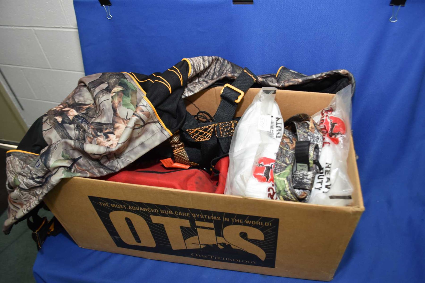 Box Lot : 2 Bags Big Buck Heavy Duty Game Bags - Camo Rifle Sling w/ quick off swivels - Red Bag: Fox Pro Spitfire Game Call - Muddy Brand Camo Vest w/ straps - Predator Decoy , etc.