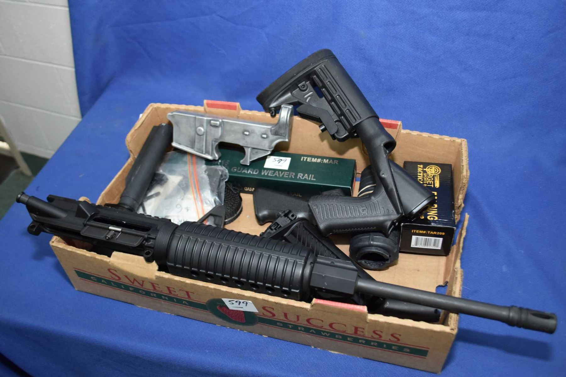 Box Lot : AR Barrel with forend & various rails - Knoxx Collapsible Butt Stock and Pistol Grip - BPMS Collapsible Butt Stock - Butler Creek Pistol Grip - Fake Solid Receiver Ornament - Grenade Launcher Fits AR - AR Sling - Some AR Parts in bag - Pistol Grip in bag - Nylon Sling - AR Composite Forend - Target Sport's Tactical Folding Vertical Grip in box - NcStar AR15 Hand Guard Weaver Rail in orig box - Rear Sight & Sling Swivel etc.