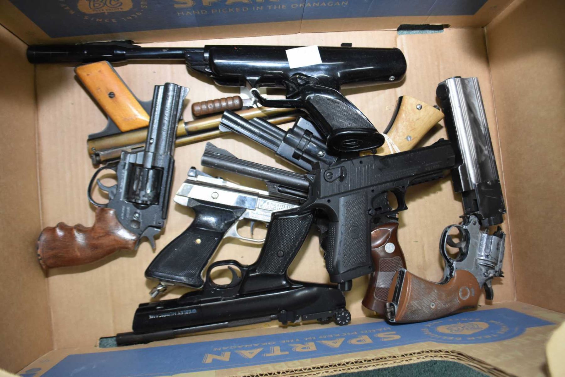Box Lot : Eight Various Pellet Pistols : BSA Scorpion - Benjamin Air Rifle Co. Model 130 - Webley Hurricane - Crosman 1800 Powermatic - Unknown Crosman Over & Under Style - Baby Desert Eagle - Crosman Model 38C - Gamo Combat R77 - etc. PAL REQ