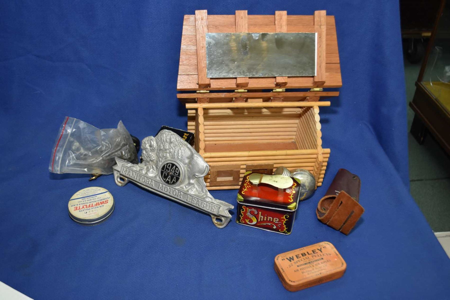 Box Lot : Hand Made Wooden Log Cabin with mirror on flip up door - 5 Cent Metal Shoe Shine Box Toy - 1949 Manitobe Motor League 1949 CAA Car Insignia - Vintage Military Oil Bottle - two trigger locks - sight parts in a bag - box & part box pellets - etc.