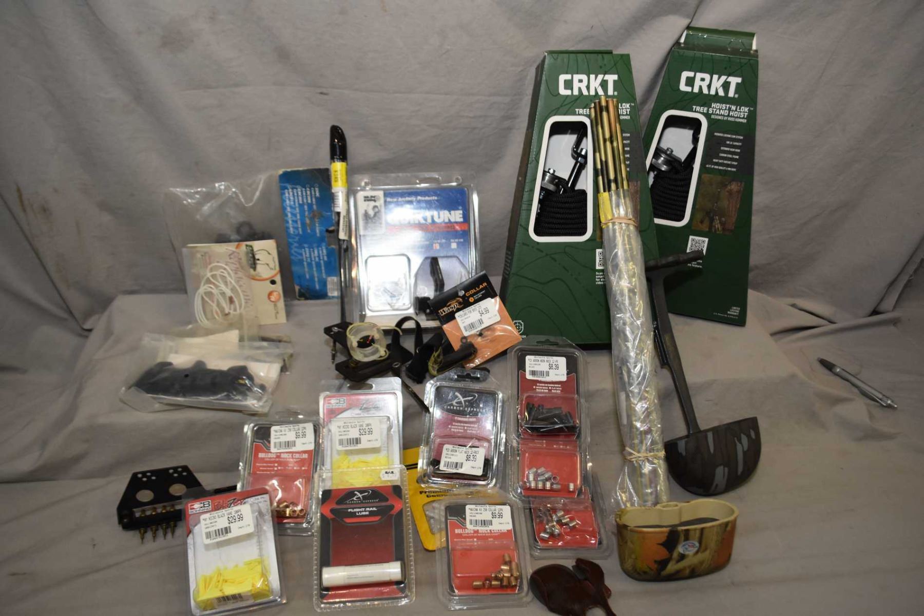 Box Lot : New in Box Tree Hoist - Various New in Pkgs Archery Accessories : raw arrows, knock sights, veins, etc.