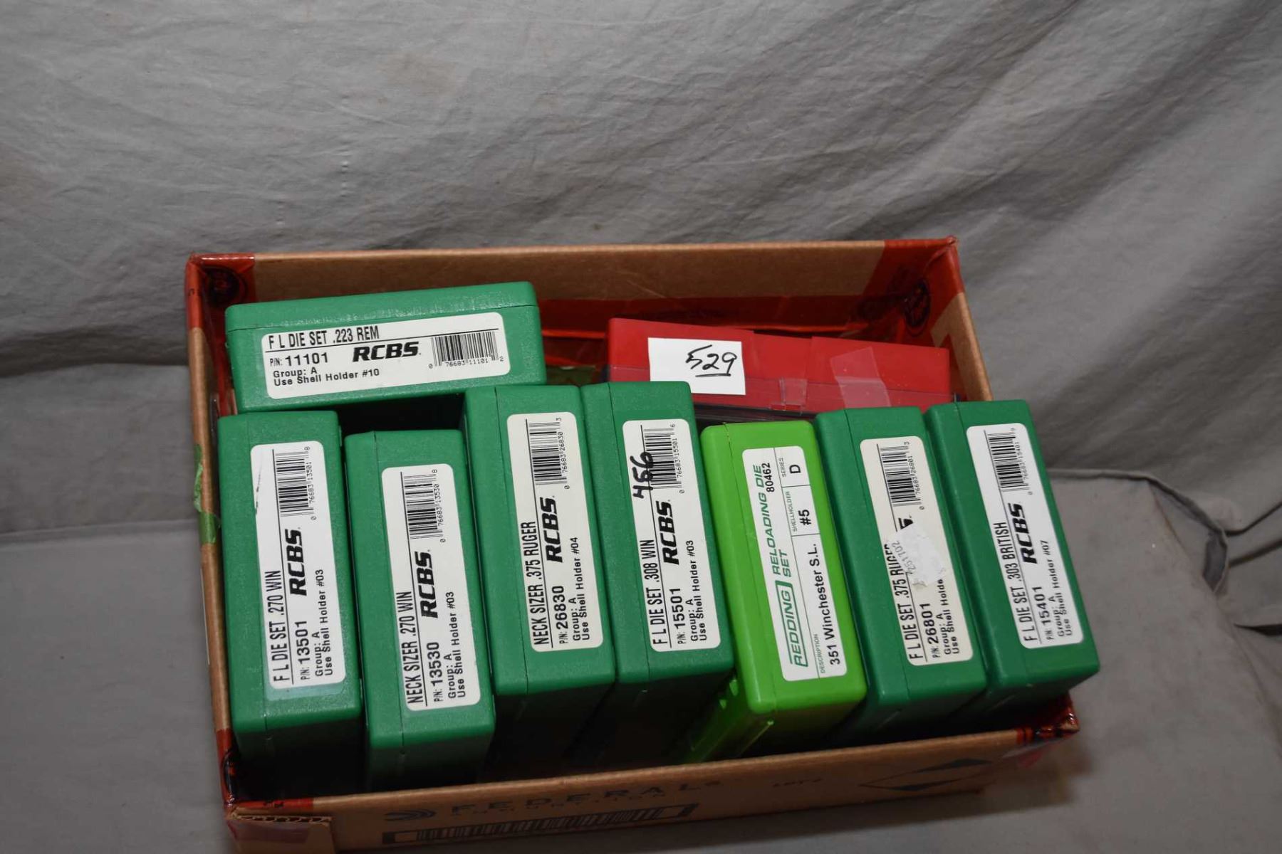 Box Lot : Nine Various Reloading Dies : .375 Ruger - .303 Brit - .351 Win SI - .308 Win - .270 - .270 Neck Sizer, .223 Rem - .9 MM Luger