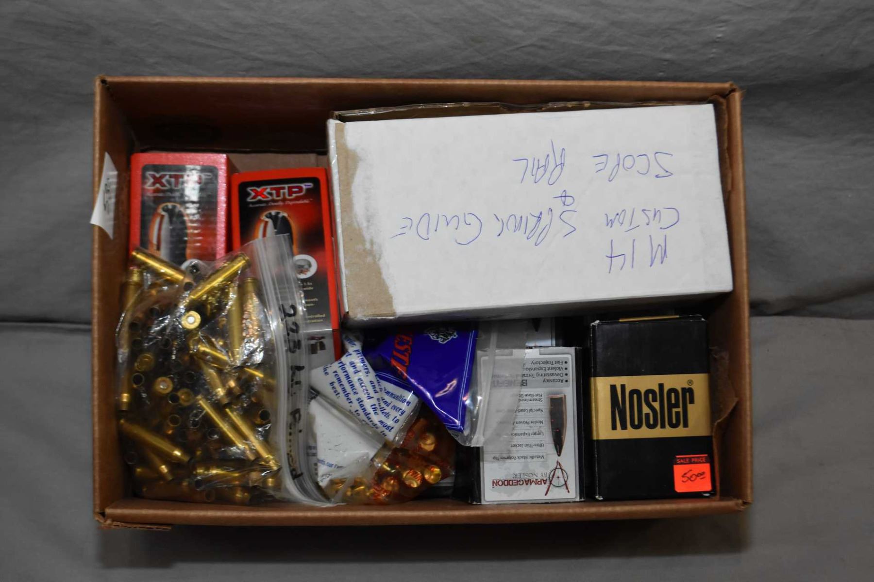 Box Lot : Seven Boxes Nosler Varmageddon Projectiles - .223 Cal - 1 Box Nosler Ballistic Tip Projectiles - 2 Boxes Hornady XTP .9 MM Projectiles - 2 Bags of Cases .9 MM & .223 Primed - M-14 Spring Guide and Scope Rail ( New ) fits Norinco Rifle