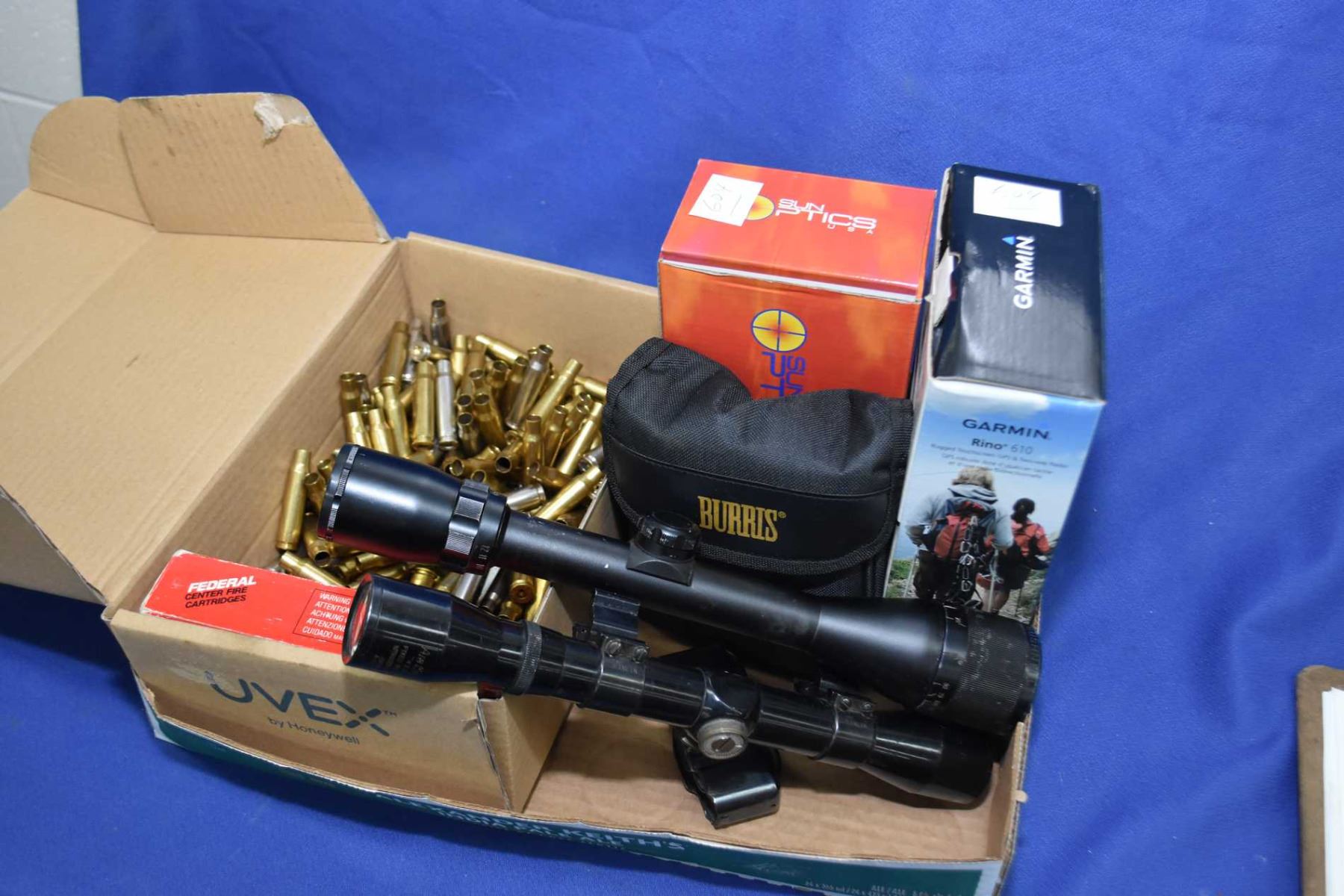 Box Lot : Sun Optics 4 X Prismatic Tactical Sight [ appears as new in orig box ] - Garmin Rino 610 Trail GPT and Two Way Radio [ appears as new in orig box ] - Burris Landmark Binoculars [ appears as new in orig case ] - Box .7 MM & .308 Cal Brass - Remington .30 - 06 Mag - Used 4 x 12 x 40 Variable Scope - Used Gamemaster 4 x 32 Scope w/rings missing the adjustment caps -