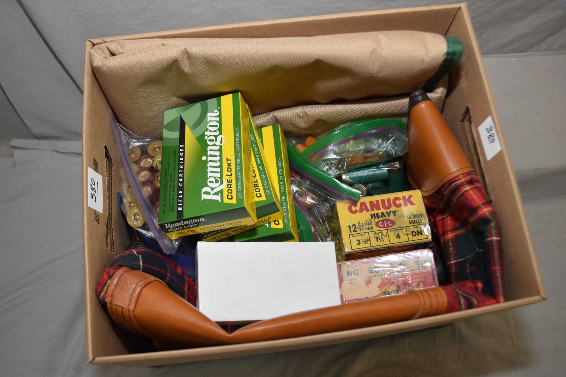 Box Lot : Two As New Rifle Cases - 2 Boxes Cancuck Collector's Shot Shells .12 Ga - Bag w/ 65 00 Buck Shot Shells - Five Bags : Approx. 10 .12 Ga Shot Shells - Plus Three Boxes ( 20 rnds per ) Remington Core - Lokt .30 -06 Cal 180 Grain Ammo - One Box ( 20 rnds ) 7.62 x 5 R Cal Ammo