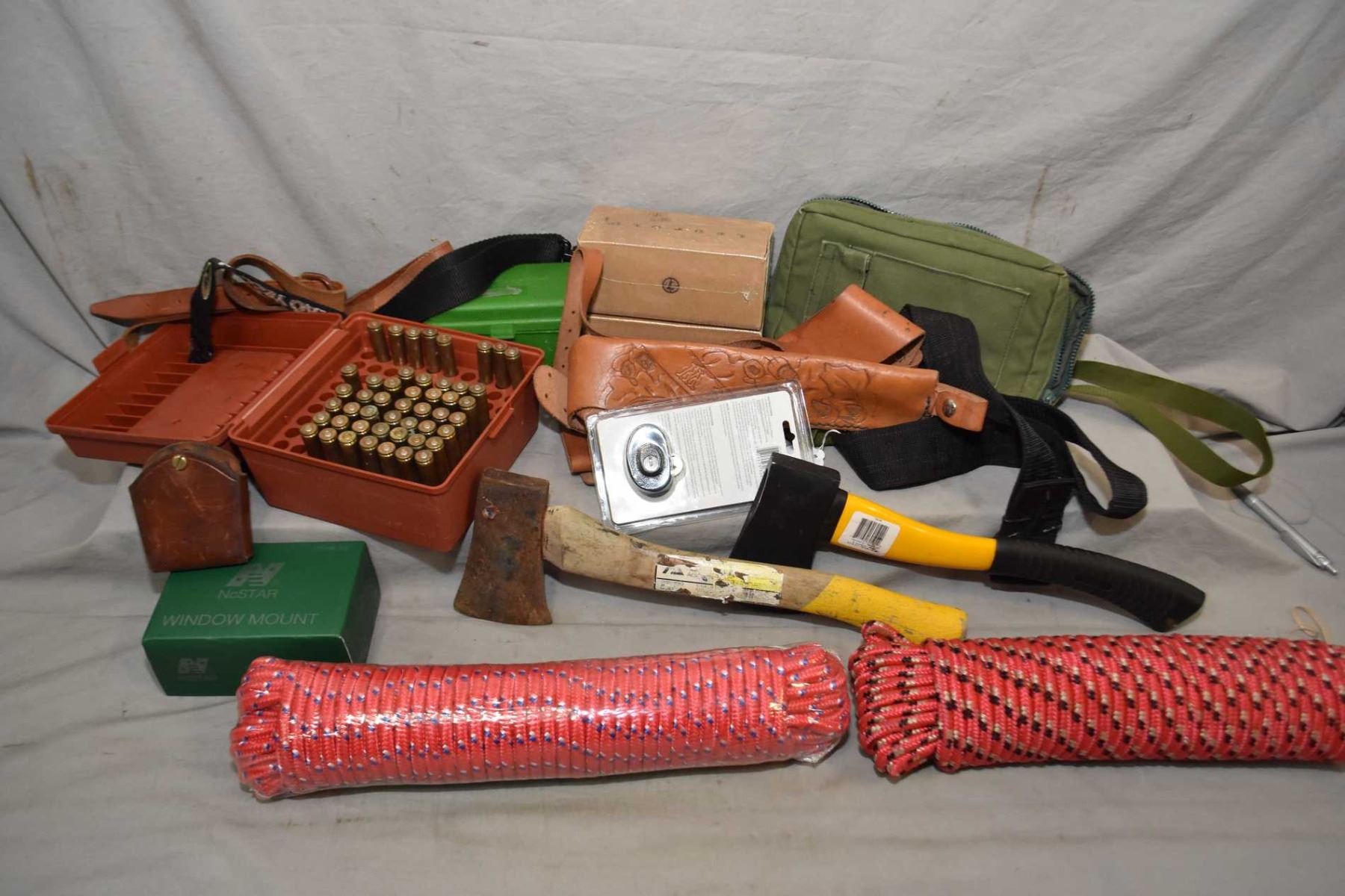 Box Lot : Two Hatchets - 2 Leupold Sun Shades - NCR Star Window Mount - 2 Red Ropes - Box 40 Rnds Factory .300 H & H Silvertip, Brass, Cases, Bags, Holster etc. PAL REQ BECAUSE OF AMMO