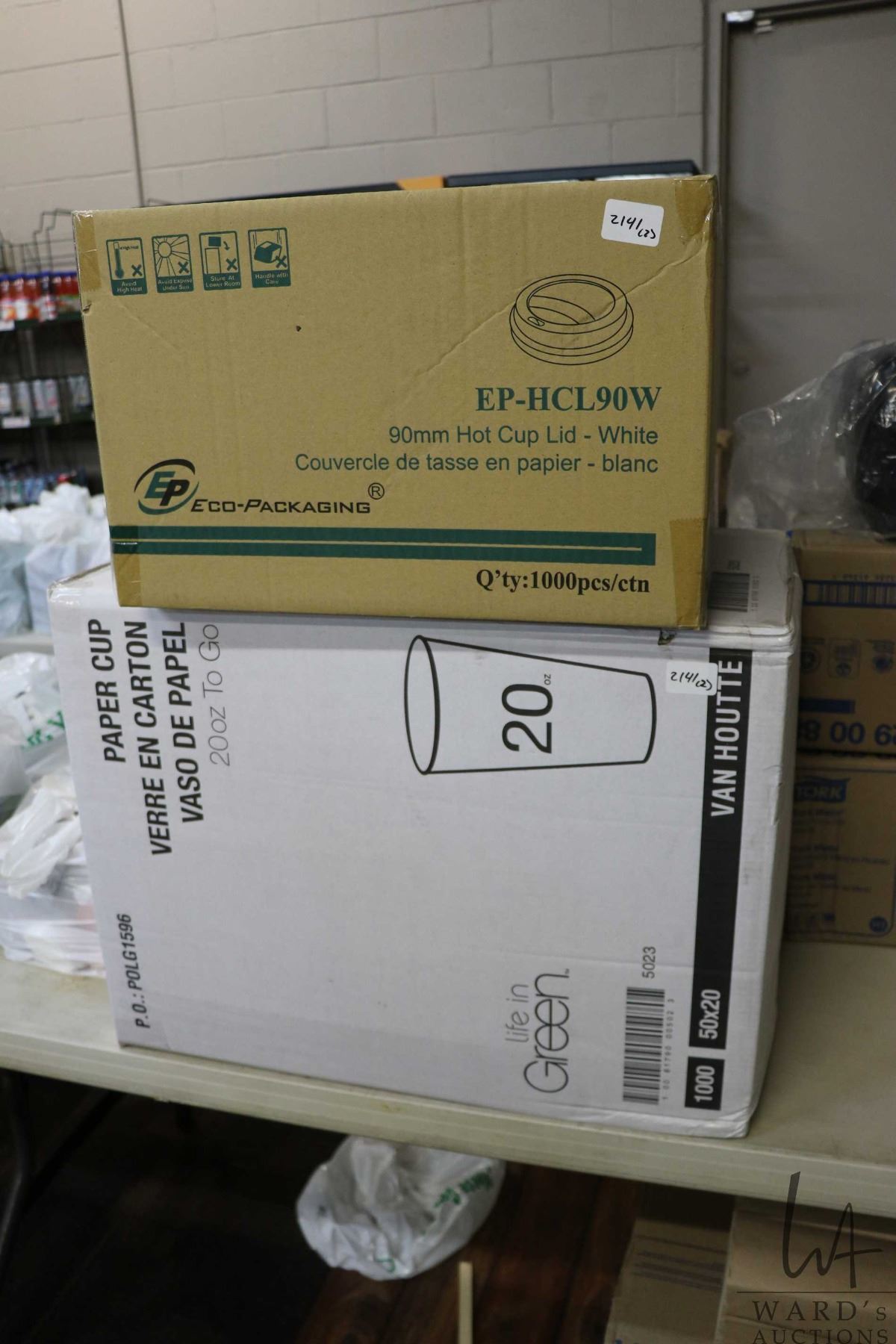 Box containing 1000 20 oz Van Houtte life in green paper cups and a box containing 1000 lids. Plus a 3/4 full box of Dura Plus single fold paper towel