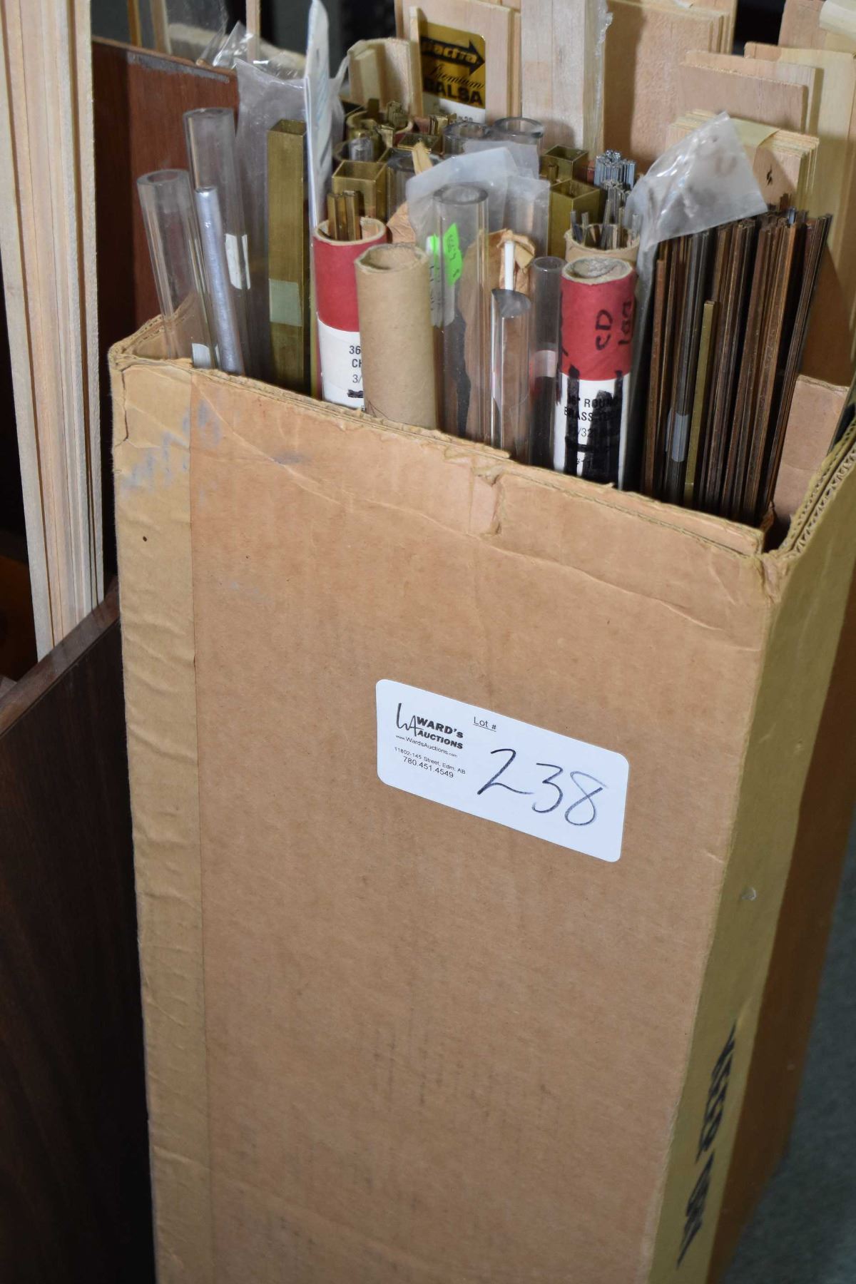 Box lot of metal channel, brass square tubing, length of plastic tubing etc.