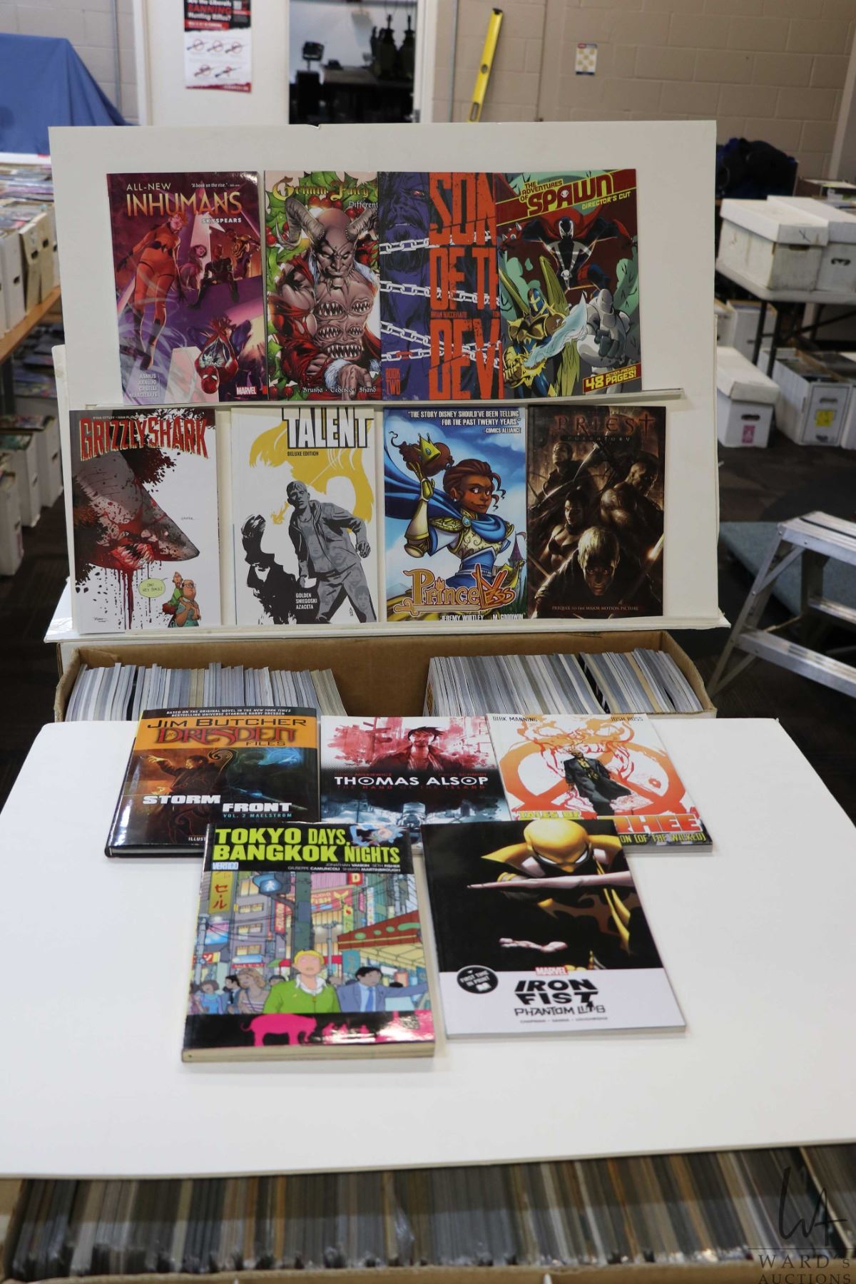 Box of approx. 103 graphic novels including Grizzley Shark, Inhumans, Princeless X, Tales of Honor, Suicide Risk, Grimm Fairy Tales, etc. Important: Pickup is in Edmonton. Long comic boxes (28 x 8 x 11.5 and 23kg) will be shipped in 2 boxes approximately 11 x 9 x 12 and 13kg each through Canada Post. Long boxes can be palletized for large invoices. Details to follow