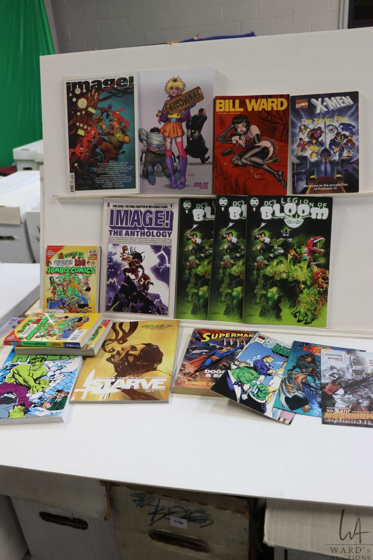 Box of approx. 52 graphic novels including Legion of Doom (several repeats), Incredible Hulk, Image, Starve, Archie, etc. Important: Pickup is in Edmonton. Long comic boxes (28 x 8 x 11.5 and 23kg) will be shipped in 2 boxes approximately 11 x 9 x 12 and 13kg each through Canada Post. Long boxes can be palletized for large invoices. Details to follow