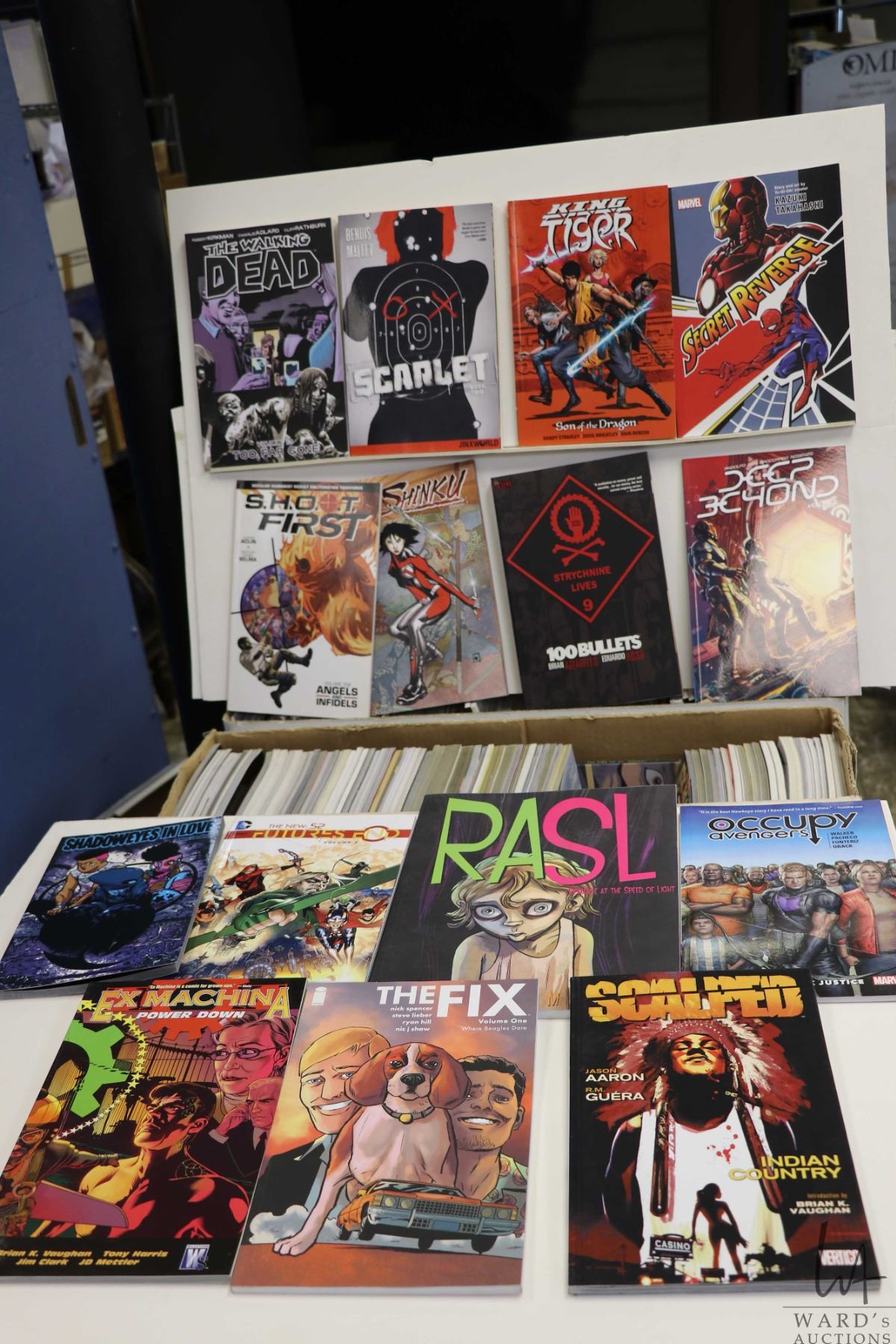 Box of approx. 91 Graphic Novels including Rasl, Occupy Avengers, King Tiger, 100 Bullets, Secret Reverse, Deep Beyond, etc. Important: Pickup is in Edmonton. Long comic boxes (28 x 8 x 11.5 and 23kg) will be shipped in 2 boxes approximately 11 x 9 x 12 and 13kg each through Canada Post. Long boxes can be palletized for large invoices. Details to follow