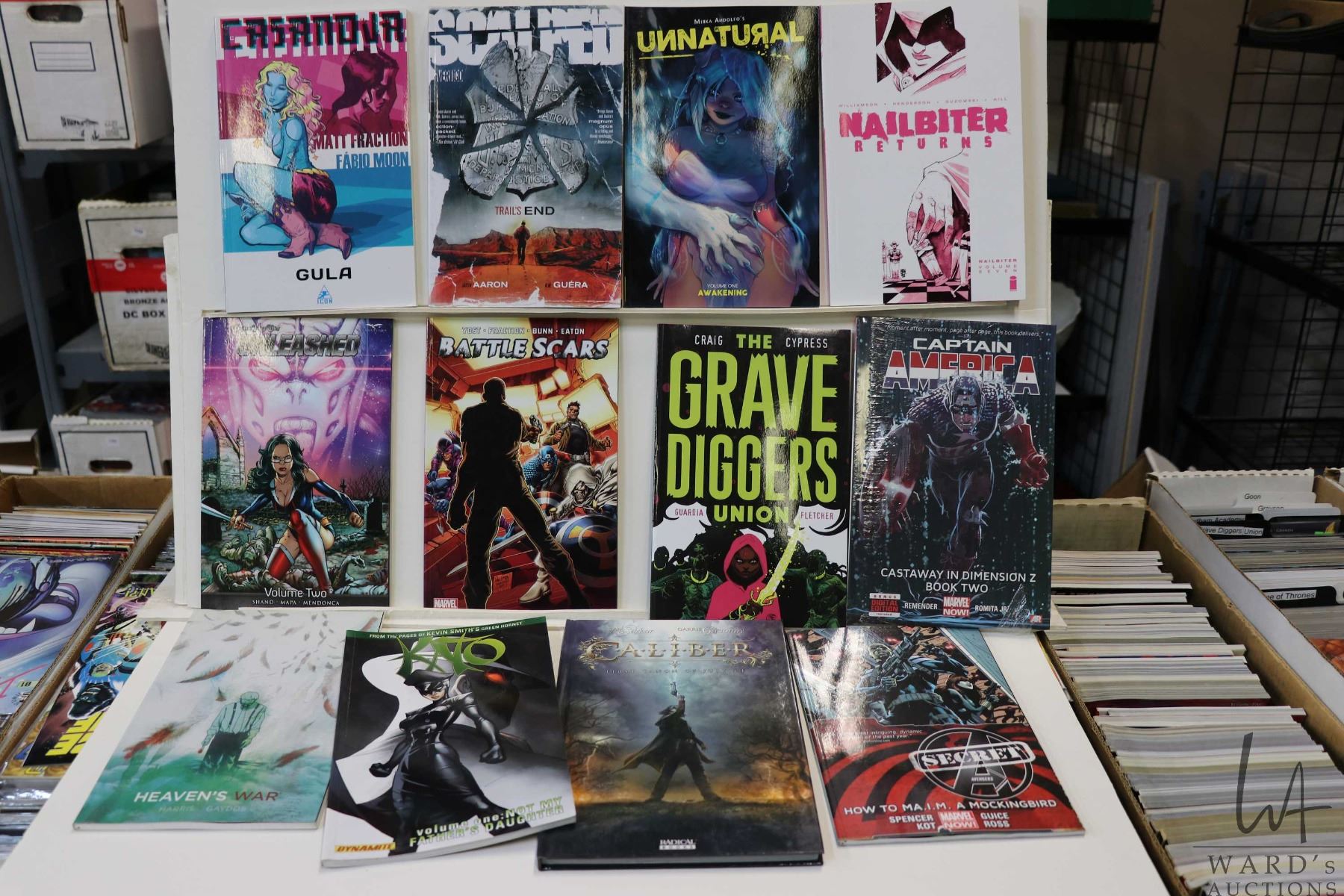 Box of approx. 99 graphic novels & hardcovers including Caliber, Secret Avengers, The Grave Diggers Union, Captain America, Heaven's War, Unleashed, etc. Important: Pickup is in Edmonton. Long comic boxes (28 x 8 x 11.5 and 23kg) will be shipped in 2 boxes approximately 11 x 9 x 12 and 13kg each through Canada Post. Long boxes can be palletized for large invoices. Details to follow