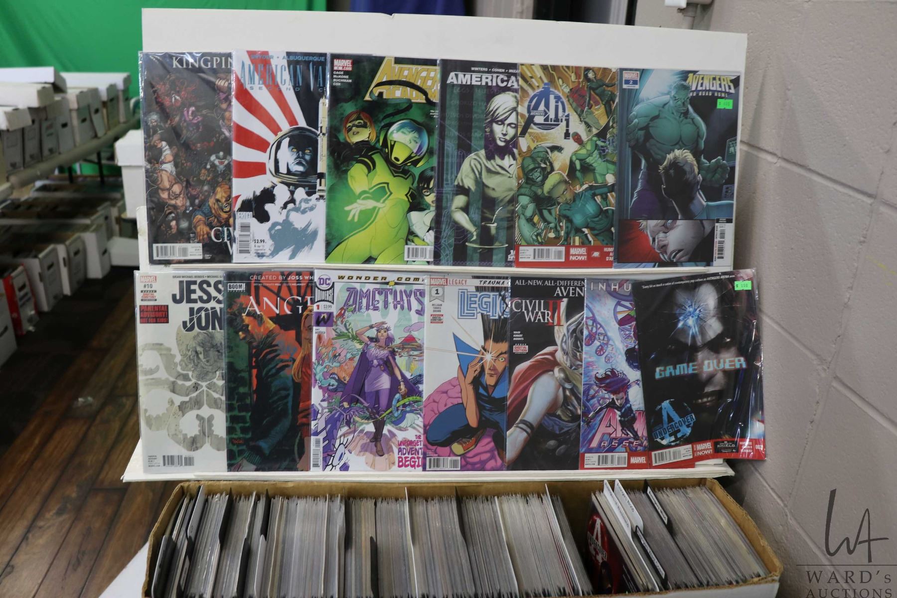 Box of approx. more than 300 comics including Avengers Academy, Amethyst, American Vampire, Angel, Kingpin, Jessica Jones, etc. Important: Pickup is in Edmonton. Long comic boxes (28 x 8 x 11.5 and 23kg) will be shipped in 2 boxes approximately 11 x 9 x 12 and 13kg each through Canada Post. Long boxes can be palletized for large invoices. Details to follow