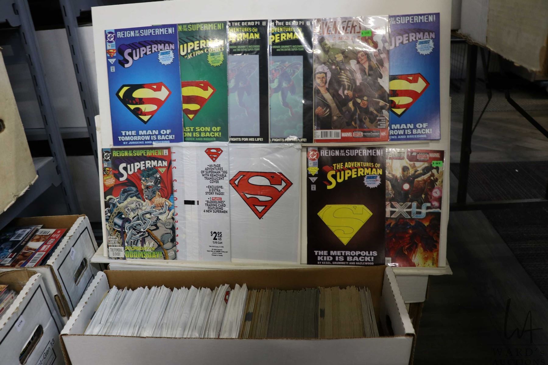 Box of approx. more than 300 comics including Avengers, Reign of the Superman, Avengers vs X-Men, etc. Important: Pickup is in Edmonton. Long comic boxes (28 x 8 x 11.5 and 23kg) will be shipped in 2 boxes approximately 11 x 9 x 12 and 13kg each through Canada Post. Long boxes can be palletized for large invoices. Details to follow