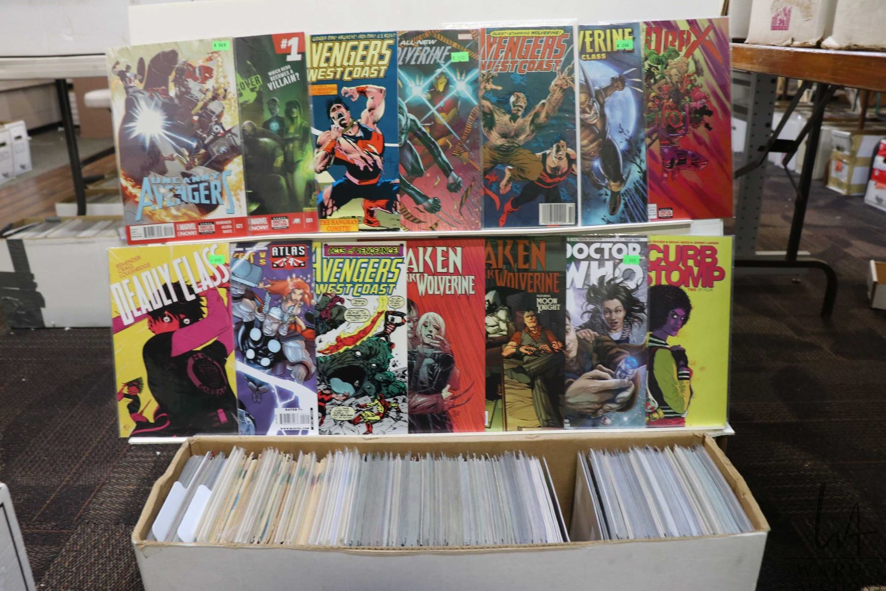 Box of approx. more than 300 comics including Avengers West Coast, Dakan Dark Wolverine, Dr. Who, Drax, Curb Stomp, etc. Important: Pickup is in Edmonton. Long comic boxes (28 x 8 x 11.5 and 23kg) will be shipped in 2 boxes approximately 11 x 9 x 12 and 13kg each through Canada Post. Long boxes can be palletized for large invoices. Details to follow