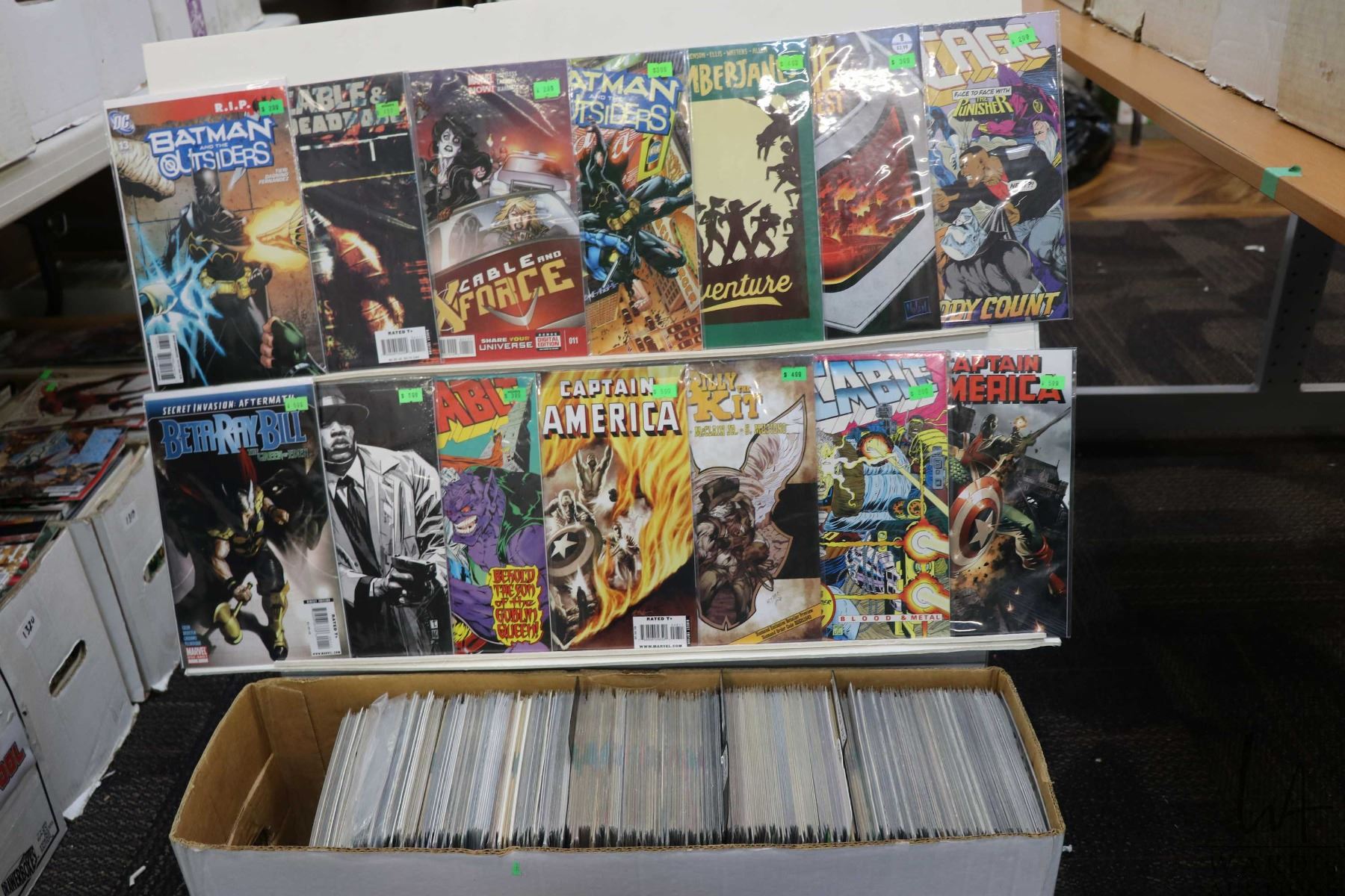 Box of approx. more than 300 comics including Batman & the Outsiders, Lumberjanes vs Lumberjacks, Billy the Kit, Bane Conquest, Cable, Cage, Captain America, etc. Important: Pickup is in Edmonton. Long comic boxes (28 x 8 x 11.5 and 23kg) will be shipped in 2 boxes approximately 11 x 9 x 12 and 13kg each through Canada Post. Long boxes can be palletized for large invoices. Details to follow