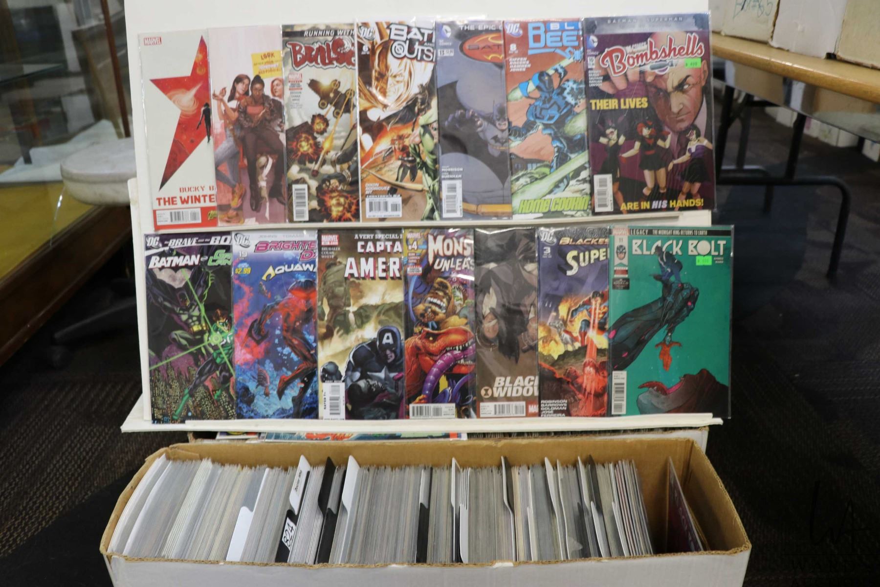 Box of approx. more than 300 comics including Captain America, Bullseye, Buffy the Vampire Slayer, The Winter Soldier, Brightest Day, Batman & Green Lantern, etc. Important: Pickup is in Edmonton. Long comic boxes (28 x 8 x 11.5 and 23kg) will be shipped in 2 boxes approximately 11 x 9 x 12 and 13kg each through Canada Post. Long boxes can be palletized for large invoices. Details to follow