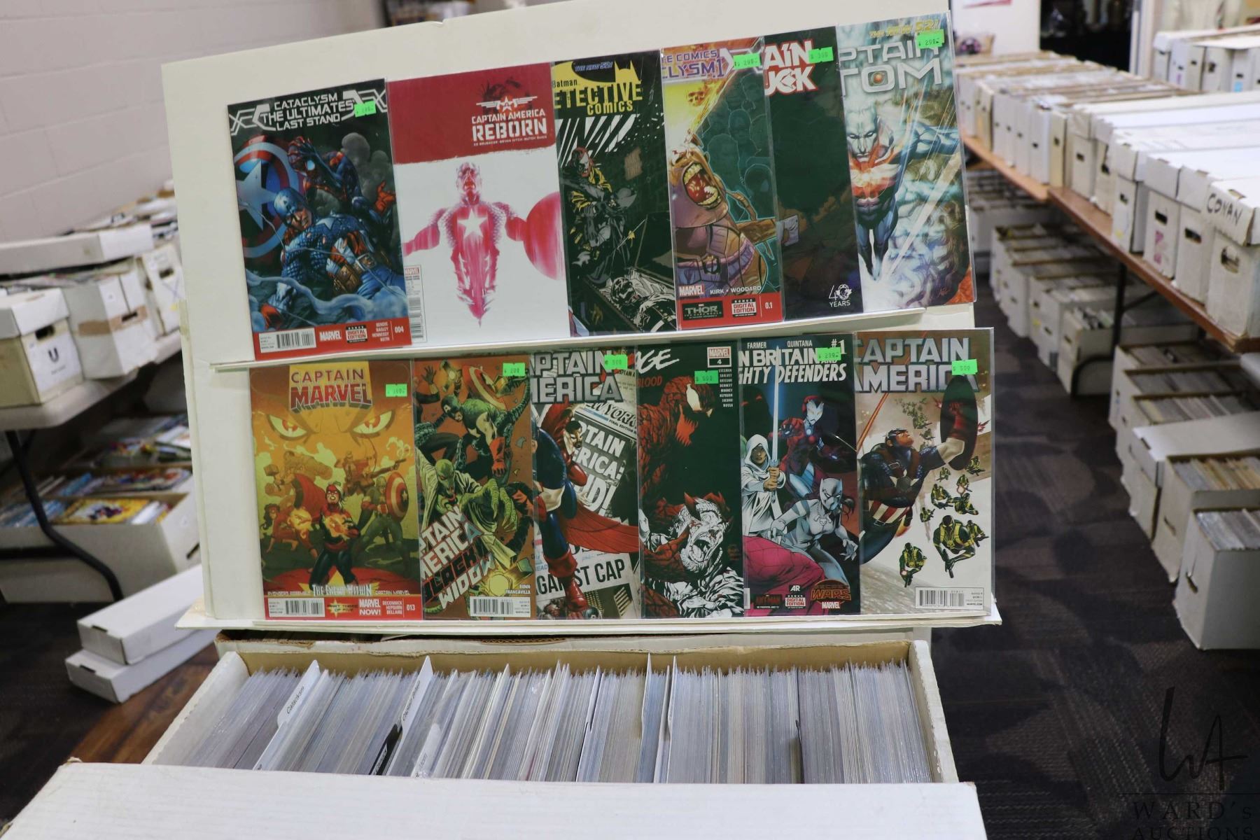 Box of approx. more than 300 comics including Carnage, Captain Canuck, Captain Brittain & The Mighty Defenders, Captain Atom, Captain America, etc. Important: Pickup is in Edmonton. Long comic boxes (28 x 8 x 11.5 and 23kg) will be shipped in 2 boxes approximately 11 x 9 x 12 and 13kg each through Canada Post. Long boxes can be palletized for large invoices. Details to follow