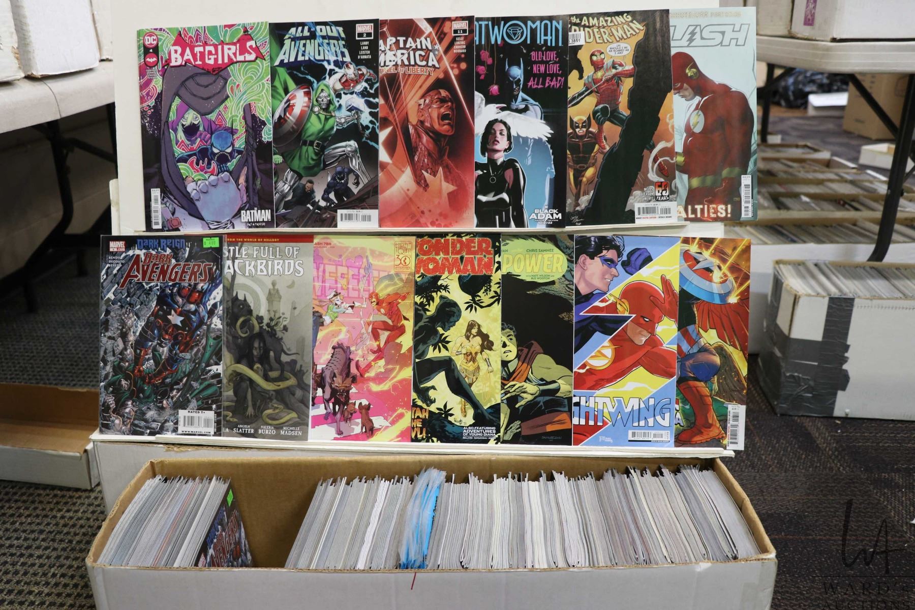 Box of approx. more than 300 comics including Catwoman, Firepower, Spiderman, Nightwing, The Flash, Captain America, etc. Important: Pickup is in Edmonton. Long comic boxes (28 x 8 x 11.5 and 23kg) will be shipped in 2 boxes approximately 11 x 9 x 12 and 13kg each through Canada Post. Long boxes can be palletized for large invoices. Details to follow