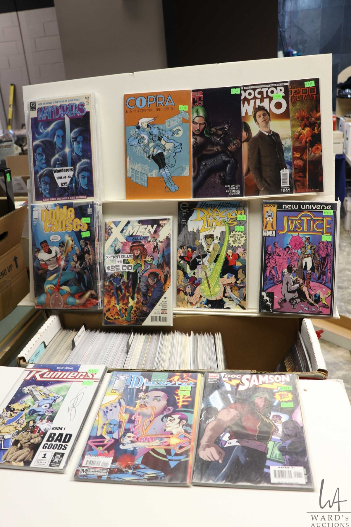 Box of approx. more than 300 comics including Copra, Dragon Lines, Cyber Force, Dr. Who, The Dreaming, Justice, etc. Important: Pickup is in Edmonton. Long comic boxes (28 x 8 x 11.5 and 23kg) will be shipped in 2 boxes approximately 11 x 9 x 12 and 13kg each through Canada Post. Long boxes can be palletized for large invoices. Details to follow