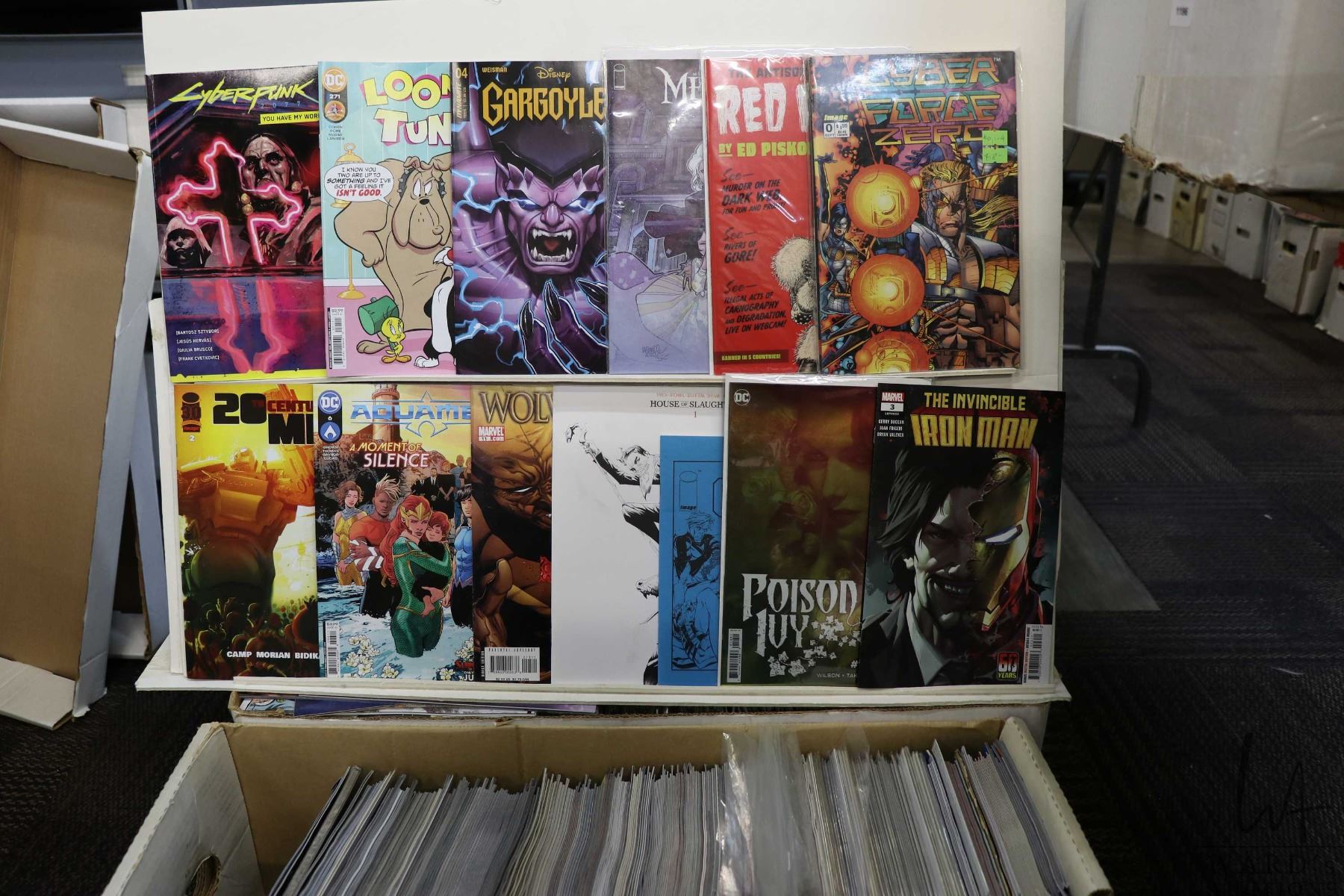 Box of approx. more than 300 comics including Cyber Punk, Wolverine Origins, Gargoyles, Looney Tunes, Aquaman, Twentieth Century Men, etc. Important: Pickup is in Edmonton. Long comic boxes (28 x 8 x 11.5 and 23kg) will be shipped in 2 boxes approximately 11 x 9 x 12 and 13kg each through Canada Post. Long boxes can be palletized for large invoices. Details to follow