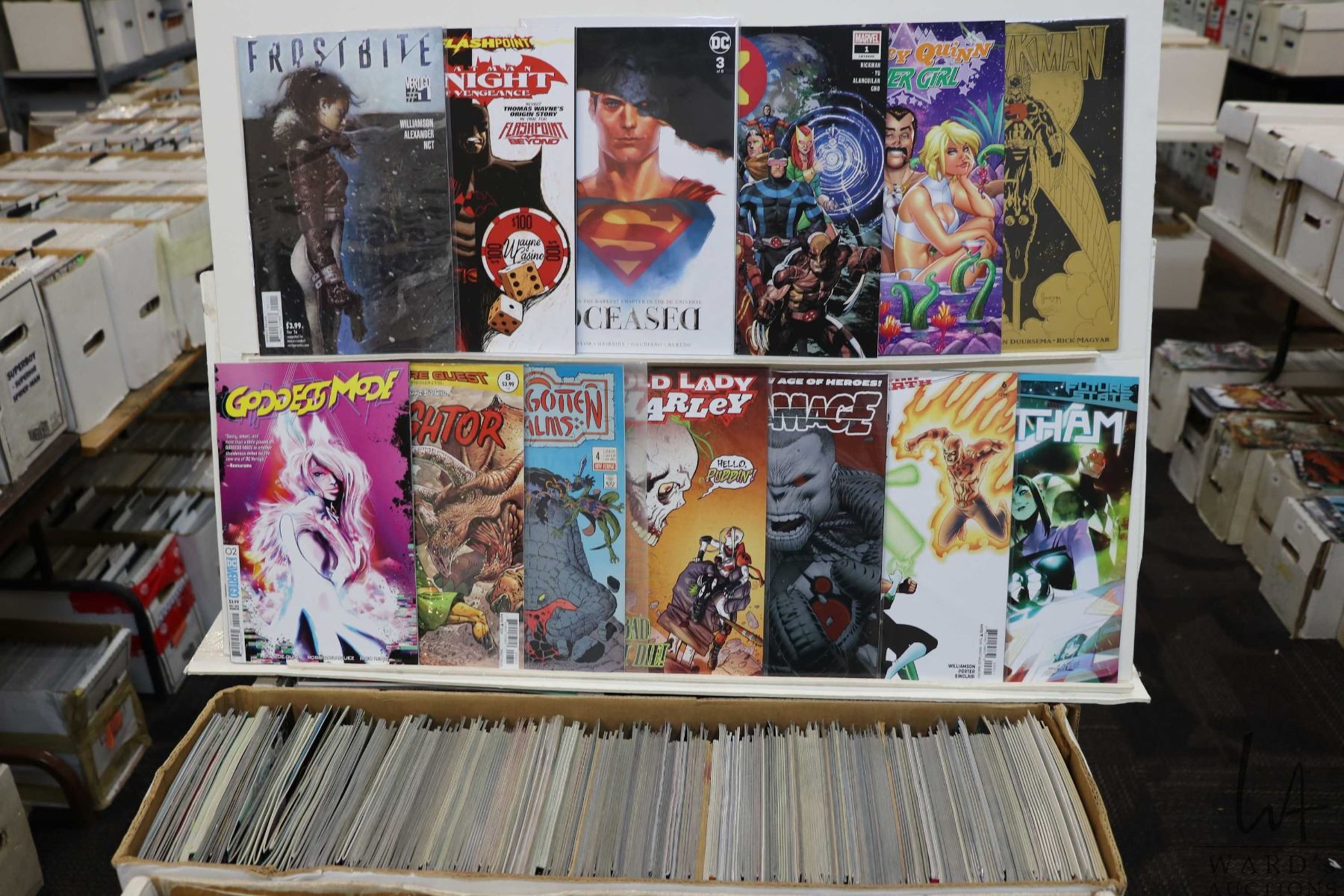 Box of approx. more than 300 comics including Damaged, X-Men, Justice League vs Suicide Squad, Harley Quinn, Gotham, Hawkman, etc. Important: Pickup is in Edmonton. Long comic boxes (28 x 8 x 11.5 and 23kg) will be shipped in 2 boxes approximately 11 x 9 x 12 and 13kg each through Canada Post. Long boxes can be palletized for large invoices. Details to follow