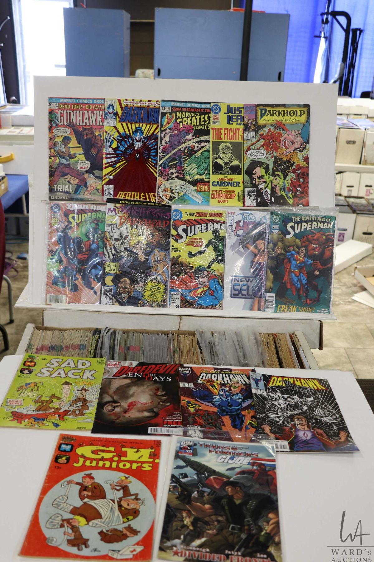Box of approx. more than 300 comics including Darkhawk, Darkhold, Daredevil, Gunhawks, Year One Superman, Sad Sack, etc. Important: Pickup is in Edmonton. Long comic boxes (28 x 8 x 11.5 and 23kg) will be shipped in 2 boxes approximately 11 x 9 x 12 and 13kg each through Canada Post. Long boxes can be palletized for large invoices. Details to follow