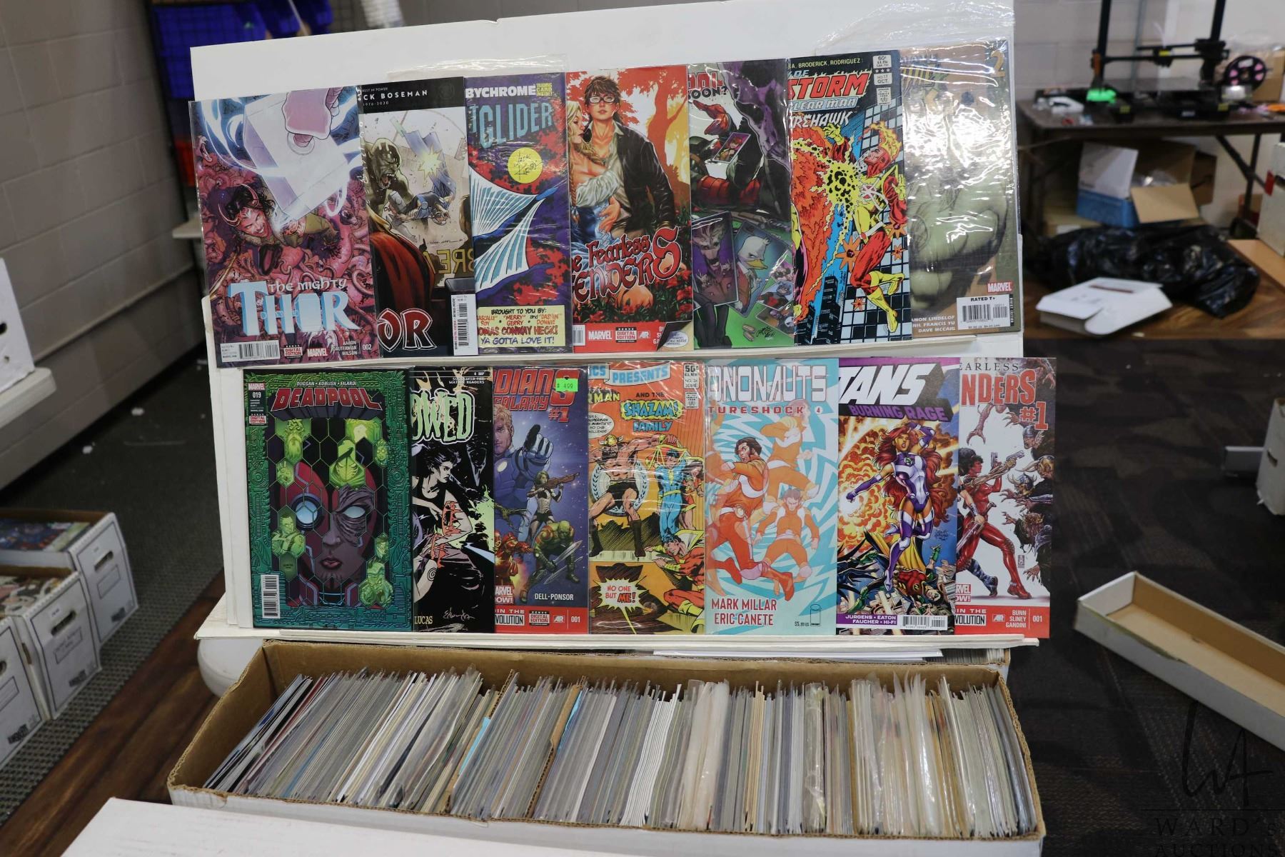 Box of approx. more than 300 comics including Deadpool, Chrononauts, Titans, Firestorm, Defenders, Wolverine & Hulk, etc. Important: Pickup is in Edmonton. Long comic boxes (28 x 8 x 11.5 and 23kg) will be shipped in 2 boxes approximately 11 x 9 x 12 and 13kg each through Canada Post. Long boxes can be palletized for large invoices. Details to follow