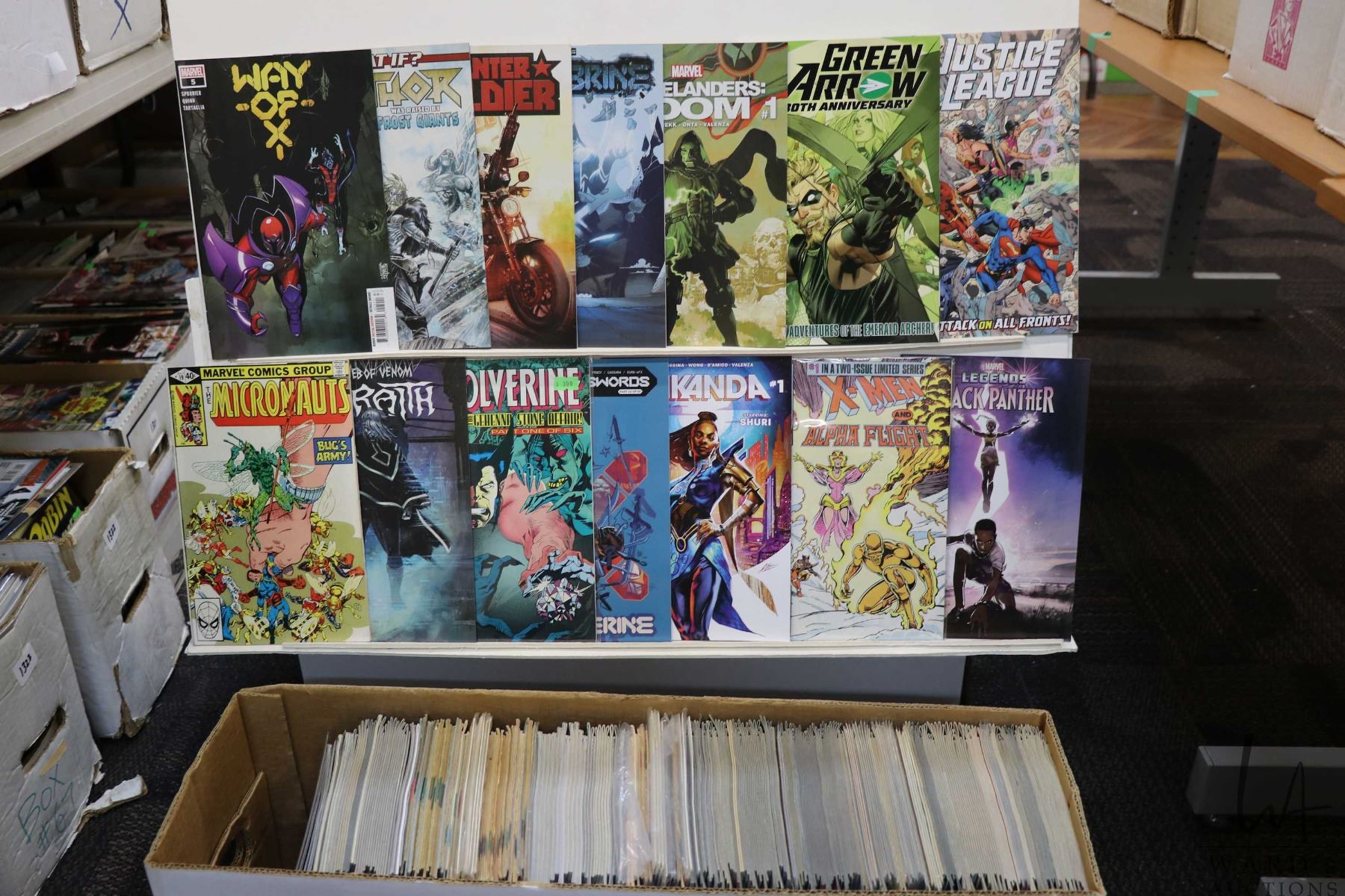 Box of approx. more than 300 comics including Doom, Wakanda, Green Arrow, X-Men, Black Panther, Justice League, etc. Important: Pickup is in Edmonton. Long comic boxes (28 x 8 x 11.5 and 23kg) will be shipped in 2 boxes approximately 11 x 9 x 12 and 13kg each through Canada Post. Long boxes can be palletized for large invoices. Details to follow