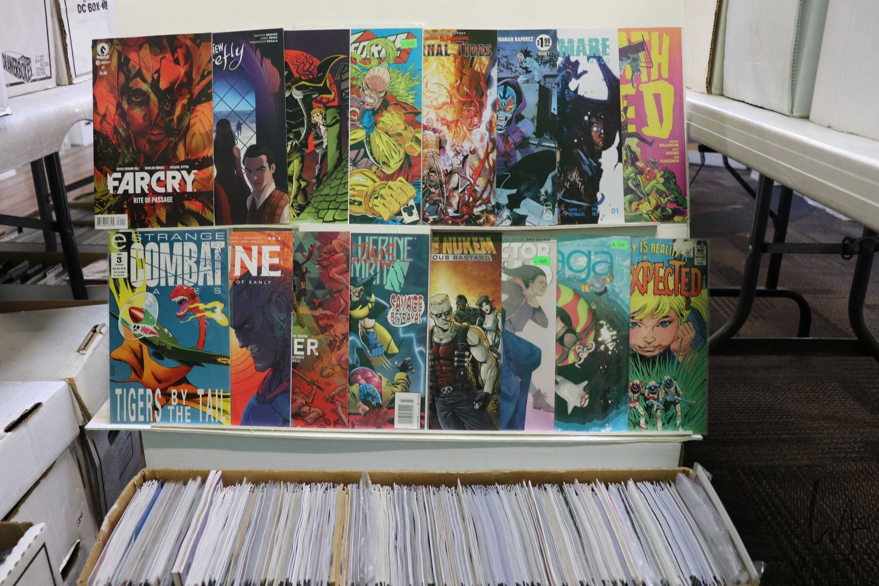 Box of approx. more than 300 comics including Duke Nukem, Infernal Tides, Dr. Who, Nightclub, Nightmare, Saga, Deathbed, Unexpected, etc. Important: Pickup is in Edmonton. Long comic boxes (28 x 8 x 11.5 and 23kg) will be shipped in 2 boxes approximately 11 x 9 x 12 and 13kg each through Canada Post. Long boxes can be palletized for large invoices. Details to follow