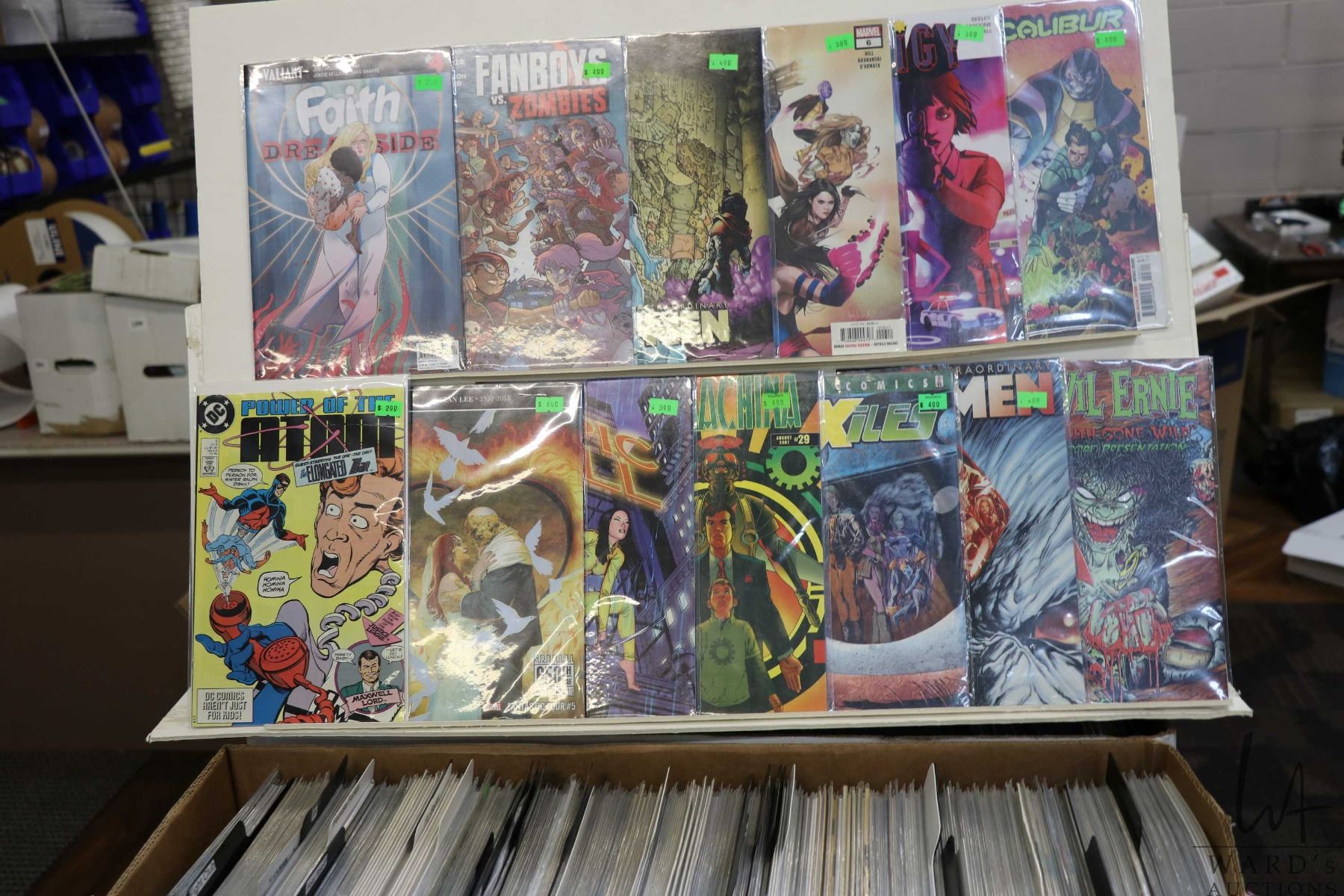 Box of approx. more than 300 comics including Exiles, Fallen Angel, Effigy, X-Men, Evil Ernie, Excalibur, etc. Important: Pickup is in Edmonton. Long comic boxes (28 x 8 x 11.5 and 23kg) will be shipped in 2 boxes approximately 11 x 9 x 12 and 13kg each through Canada Post. Long boxes can be palletized for large invoices. Details to follow