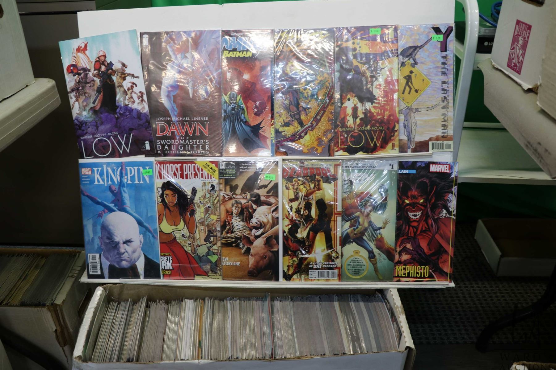 Box of approx. more than 300 comics including Ghost Rider, Deadpool, X-Men, Low, The Last Man, Mephisto, etc. Important: Pickup is in Edmonton. Long comic boxes (28 x 8 x 11.5 and 23kg) will be shipped in 2 boxes approximately 11 x 9 x 12 and 13kg each through Canada Post. Long boxes can be palletized for large invoices. Details to follow