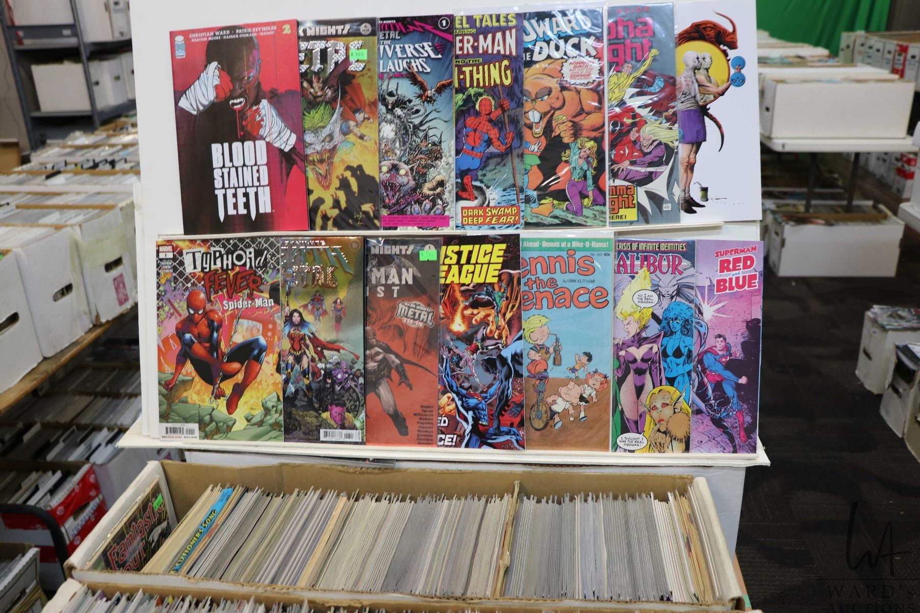 Box of approx. more than 300 comics including Howard the Duck, Dennis the Menace, Alpha Fight, X-Calibur, Rorschach, Superman Red & Blue, etc. Important: Pickup is in Edmonton. Long comic boxes (28 x 8 x 11.5 and 23kg) will be shipped in 2 boxes approximately 11 x 9 x 12 and 13kg each through Canada Post. Long boxes can be palletized for large invoices. Details to follow