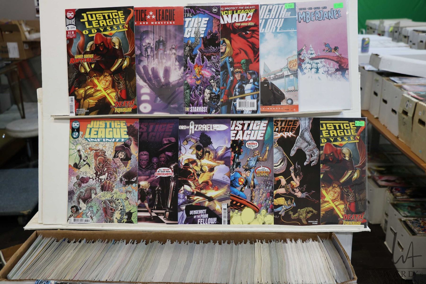 Box of approx. more than 300 comics including Justice League Canada, Justice League, Death or Glory, Justice League Dark, Justice League Odyssey, Lumberjanes, etc. Important: Pickup is in Edmonton. Long comic boxes (28 x 8 x 11.5 and 23kg) will be shipped in 2 boxes approximately 11 x 9 x 12 and 13kg each through Canada Post. Long boxes can be palletized for large invoices. Details to follow