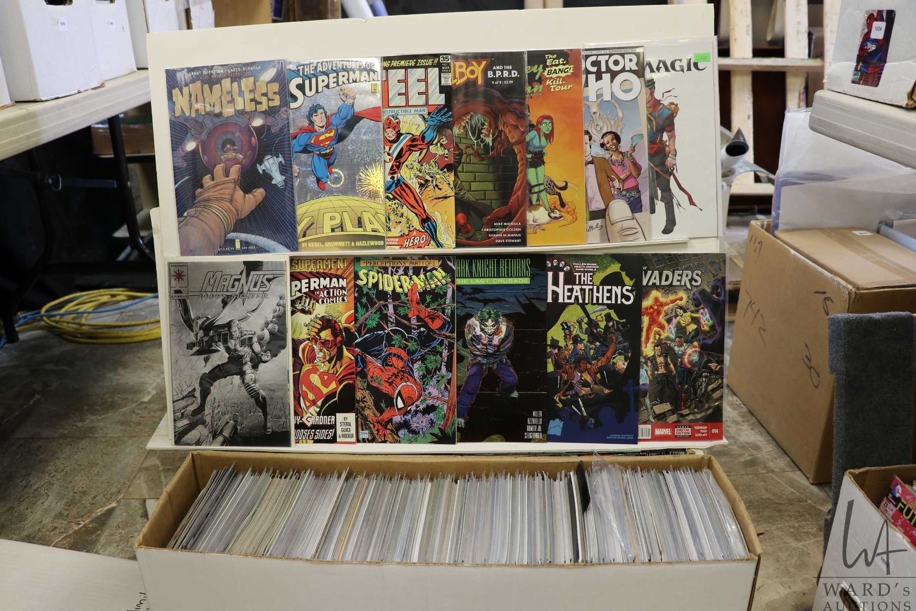 Box of approx. more than 300 comics including Magic, Hellboy, Harley Quinn, The Heathens, Dr. Who, All New Invaders, etc. Important: Pickup is in Edmonton. Long comic boxes (28 x 8 x 11.5 and 23kg) will be shipped in 2 boxes approximately 11 x 9 x 12 and 13kg each through Canada Post. Long boxes can be palletized for large invoices. Details to follow