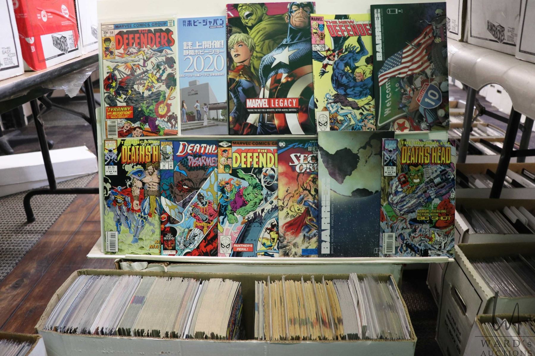 Box of approx. more than 300 comics including Marvel Legacy, Barrier, The Secret Origin, The Defenders, Deaths Head, Deathlok, etc. Important: Pickup is in Edmonton. Long comic boxes (28 x 8 x 11.5 and 23kg) will be shipped in 2 boxes approximately 11 x 9 x 12 and 13kg each through Canada Post. Long boxes can be palletized for large invoices. Details to follow