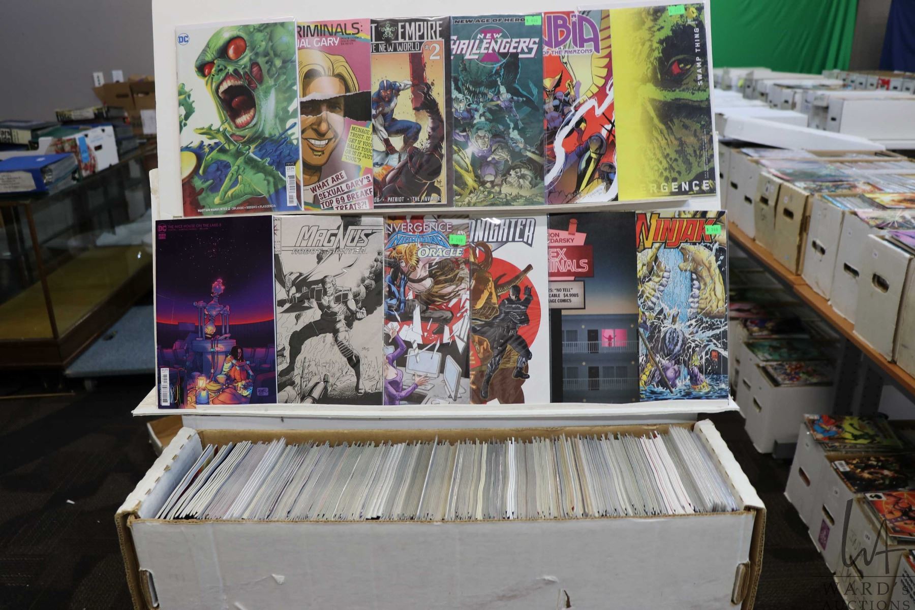 Box of approx. more than 300 comics including Midnighter, New Challengers, Nubia Queen of the Amazon, Sex Criminals, Swamp Thing, Ninjak, etc. Important: Pickup is in Edmonton. Long comic boxes (28 x 8 x 11.5 and 23kg) will be shipped in 2 boxes approximately 11 x 9 x 12 and 13kg each through Canada Post. Long boxes can be palletized for large invoices. Details to follow