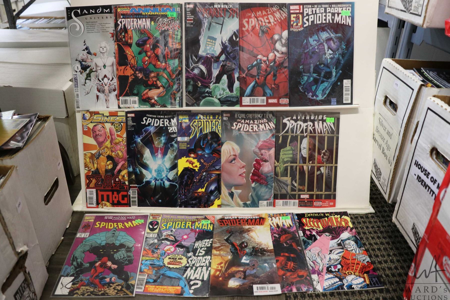 Box of approx. more than 300 comics including Peter Parker Spider-Man, Spider-Man & Electra, Sandman, Spider-Man 2099, Sinestro, etc. Important: Pickup is in Edmonton. Long comic boxes (28 x 8 x 11.5 and 23kg) will be shipped in 2 boxes approximately 11 x 9 x 12 and 13kg each through Canada Post. Long boxes can be palletized for large invoices. Details to follow