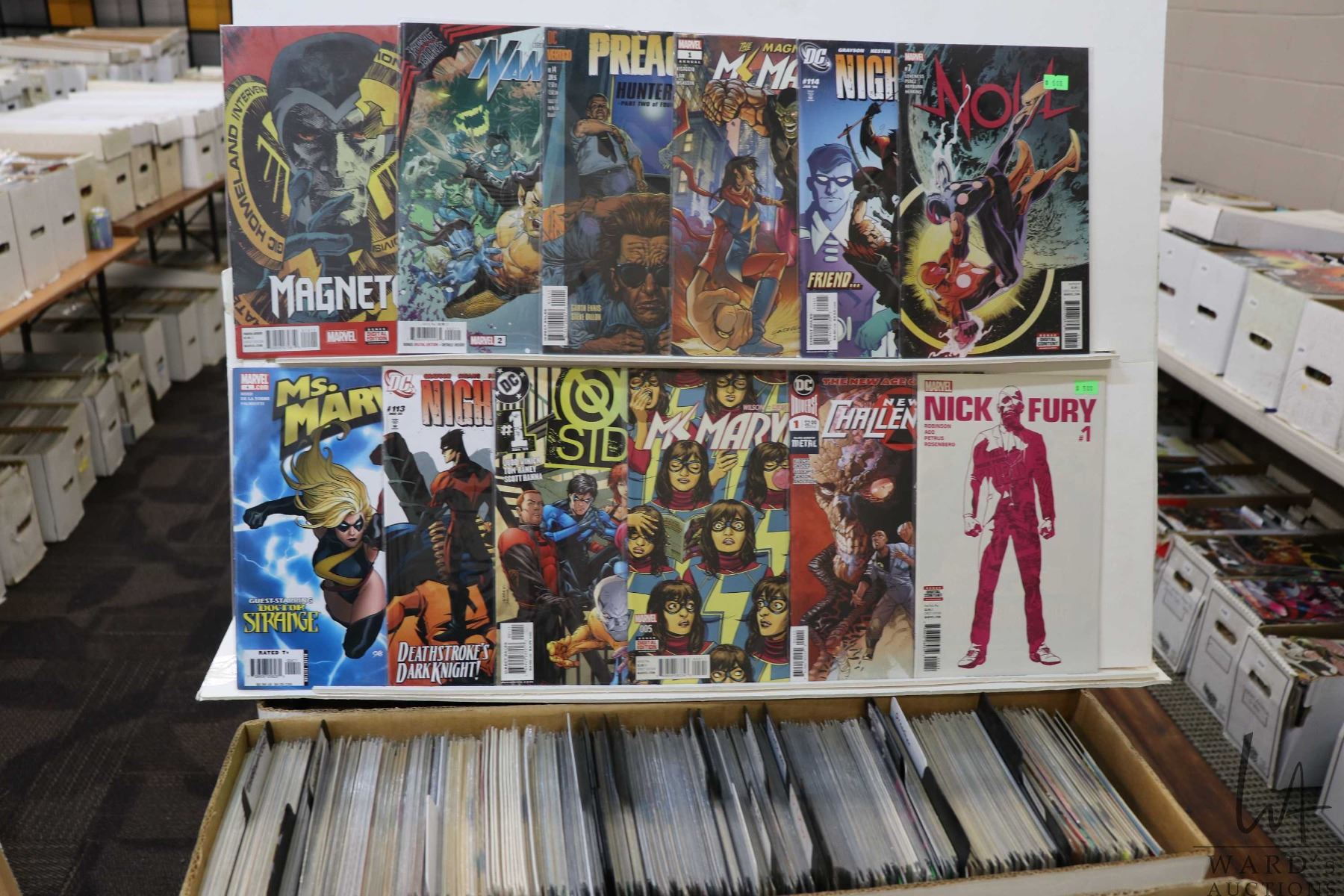 Box of approx. more than 300 comics including Preacher, Outsiders, Nightwing, Namor, Magneto, Ms. Marvel, etc. Important: Pickup is in Edmonton. Long comic boxes (28 x 8 x 11.5 and 23kg) will be shipped in 2 boxes approximately 11 x 9 x 12 and 13kg each through Canada Post. Long boxes can be palletized for large invoices. Details to follow