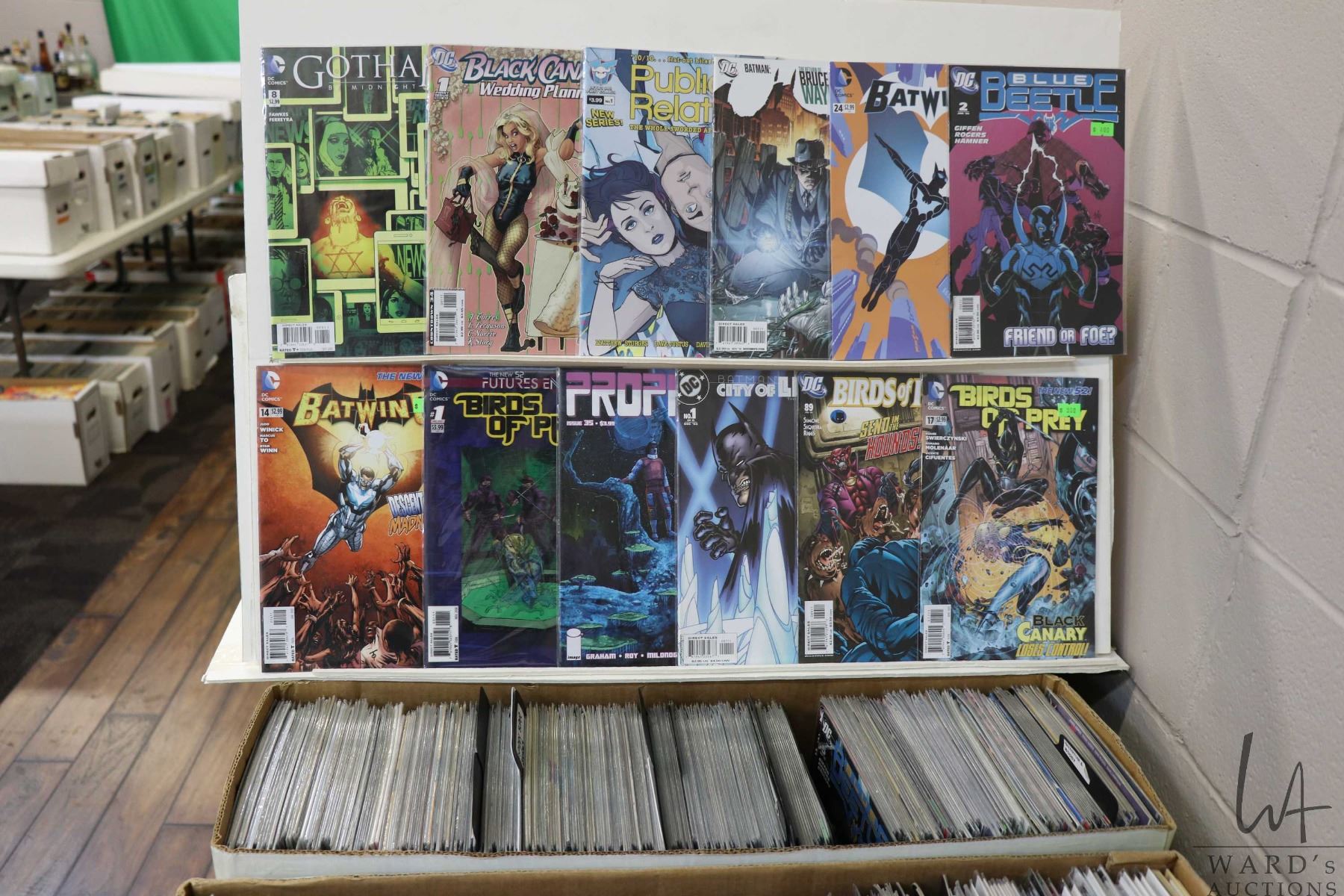 Box of approx. more than 300 comics including Public Relations, Profit, Black Canary, Birds of Prey, Gotham, Batwing, etc. Important: Pickup is in Edmonton. Long comic boxes (28 x 8 x 11.5 and 23kg) will be shipped in 2 boxes approximately 11 x 9 x 12 and 13kg each through Canada Post. Long boxes can be palletized for large invoices. Details to follow
