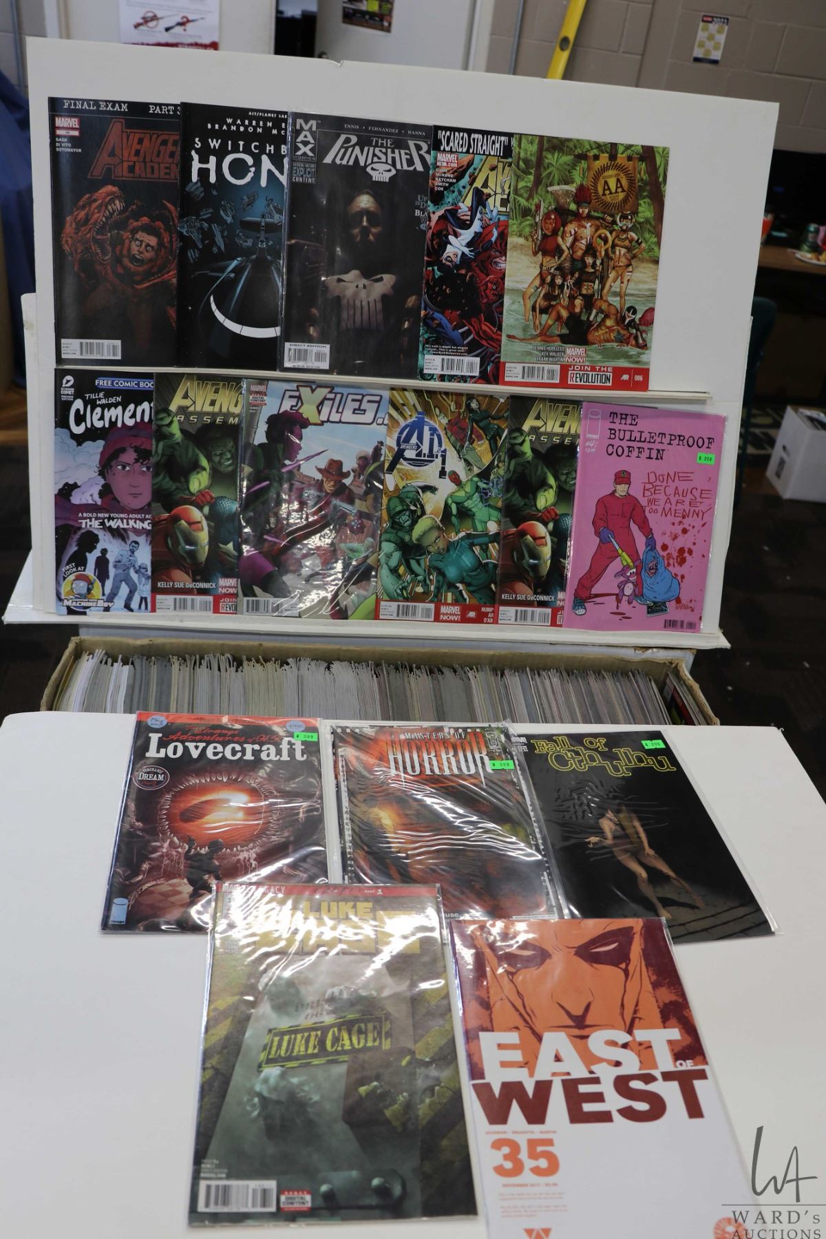 Box of approx. more than 300 comics including Punisher, Exiles, Switchblade Honey, Avengers Asssemble, Avengers Academy, Clementine, etc. Important: Pickup is in Edmonton. Long comic boxes (28 x 8 x 11.5 and 23kg) will be shipped in 2 boxes approximately 11 x 9 x 12 and 13kg each through Canada Post. Long boxes can be palletized for large invoices. Details to follow