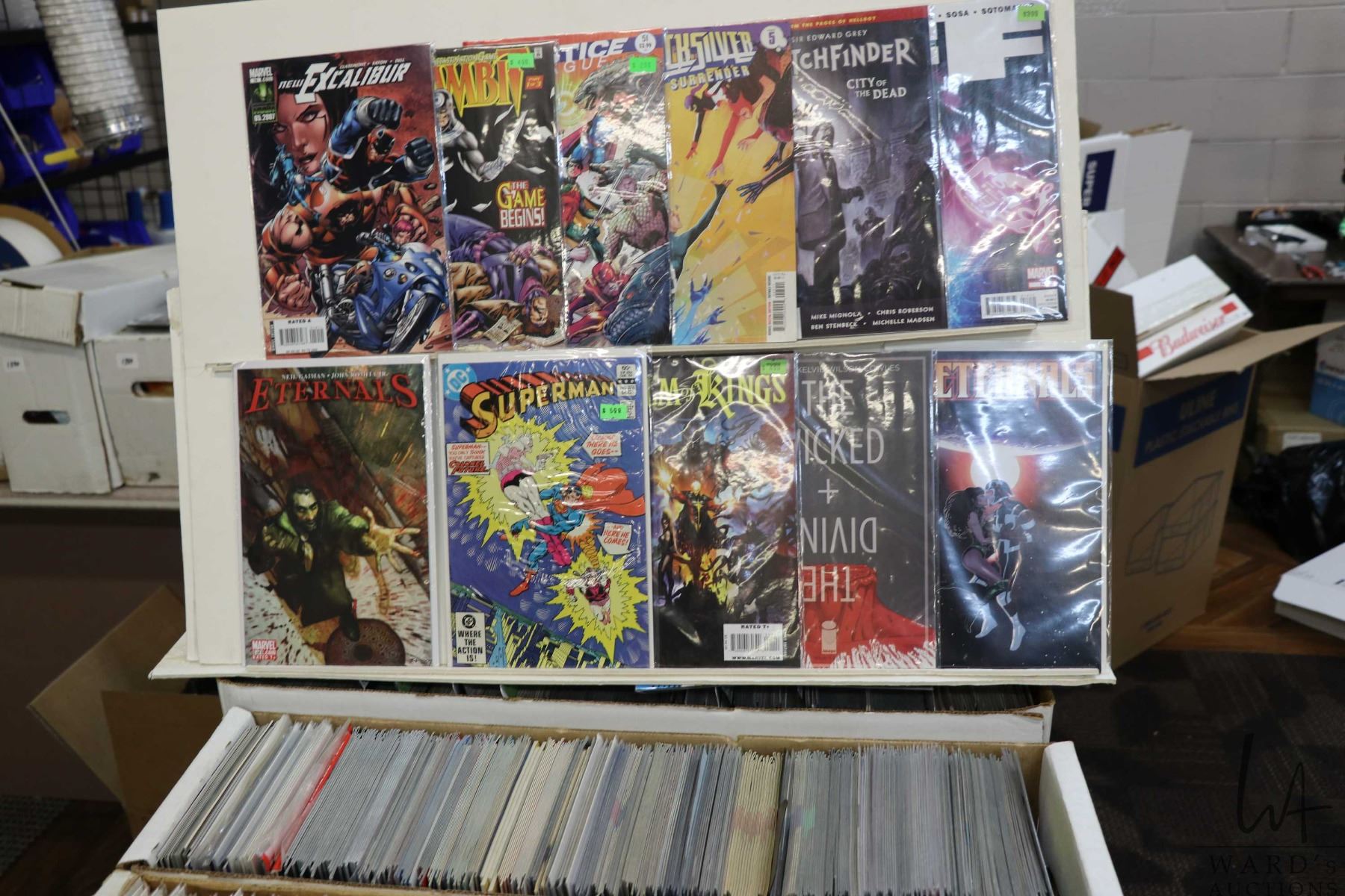 Box of approx. more than 300 comics including Quicksilver, Realm of Kings, The Wicked and the Divine, Witchfinder, FF, Eternals, etc. Important: Pickup is in Edmonton. Long comic boxes (28 x 8 x 11.5 and 23kg) will be shipped in 2 boxes approximately 11 x 9 x 12 and 13kg each through Canada Post. Long boxes can be palletized for large invoices. Details to follow