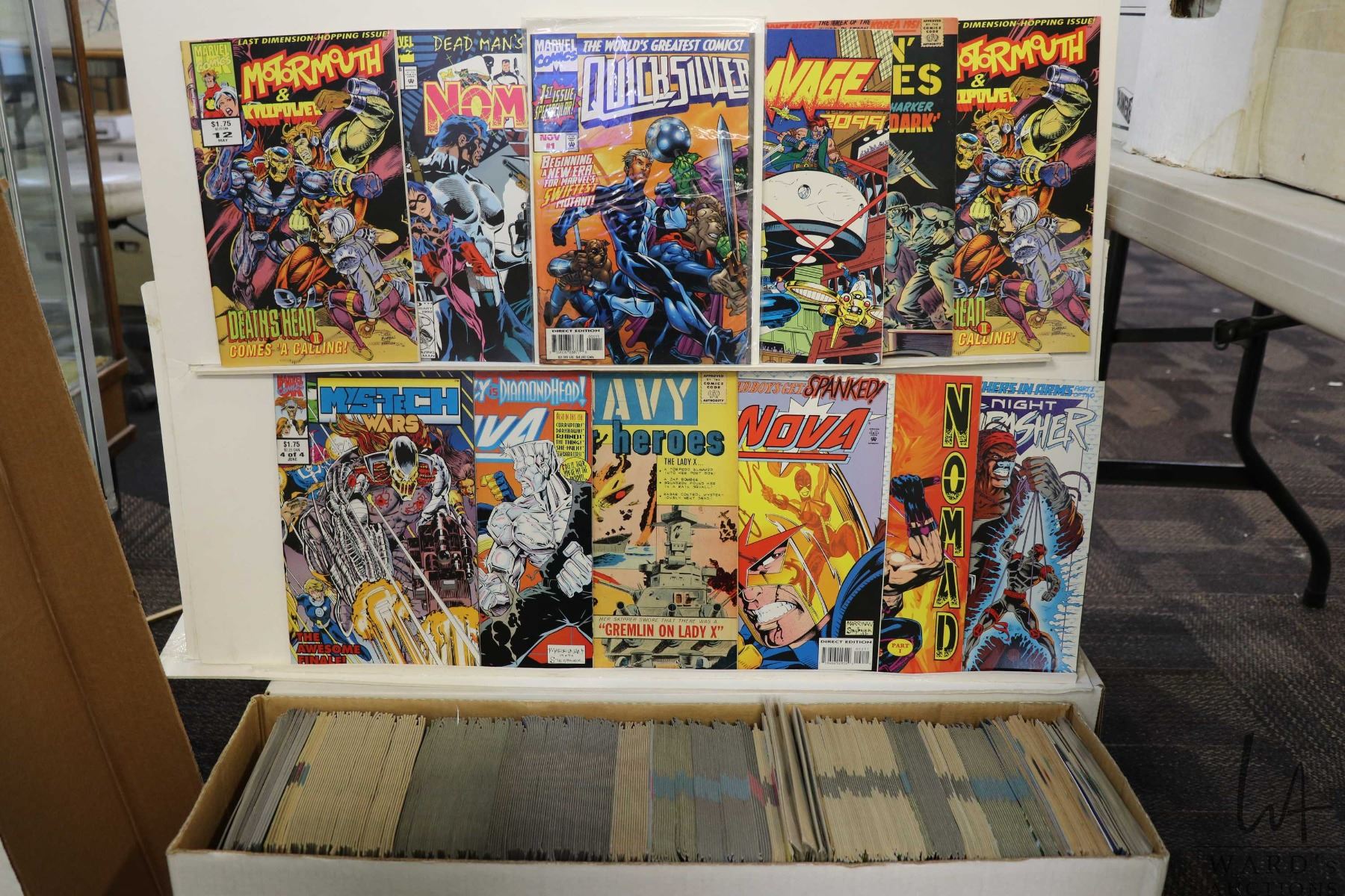 Box of approx. more than 300 comics including Rabage 2099, Fightin Marines, Nova, Nomad, Night Thrasher, Motormouth, etc. Important: Pickup is in Edmonton. Long comic boxes (28 x 8 x 11.5 and 23kg) will be shipped in 2 boxes approximately 11 x 9 x 12 and 13kg each through Canada Post. Long boxes can be palletized for large invoices. Details to follow