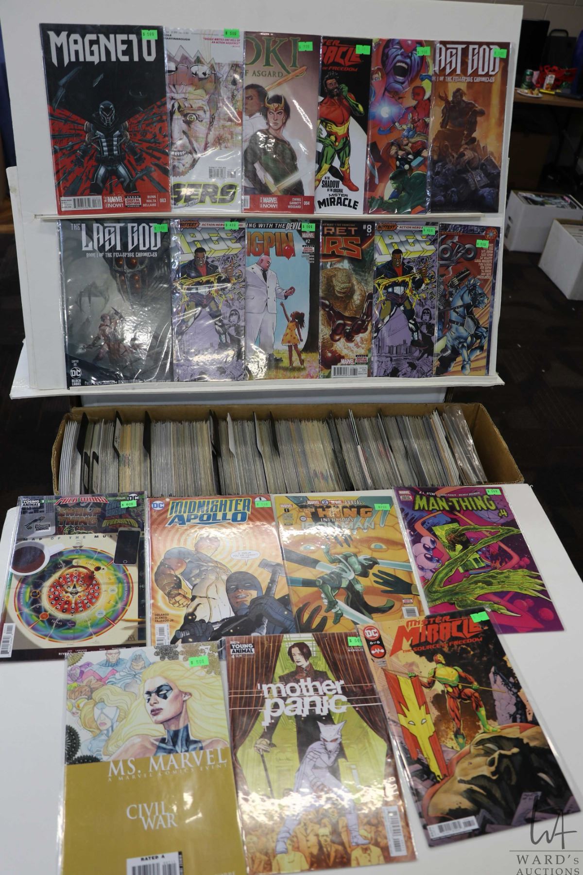 Box of approx. more than 300 comics including Secret Wars, Mr. Miracle, Kang The Conqueror, Cage, Tha Last God, Lobo, etc. Important: Pickup is in Edmonton. Long comic boxes (28 x 8 x 11.5 and 23kg) will be shipped in 2 boxes approximately 11 x 9 x 12 and 13kg each through Canada Post. Long boxes can be palletized for large invoices. Details to follow