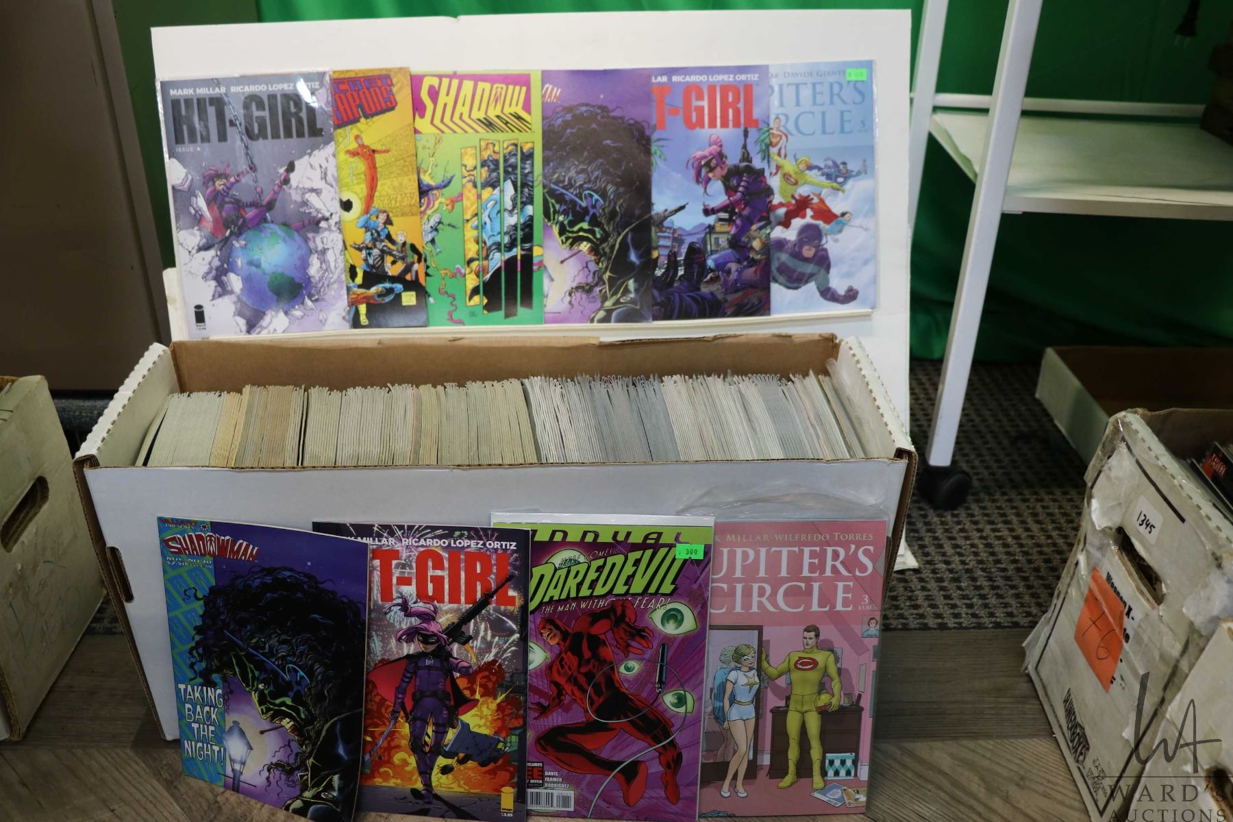 Box of approx. more than 300 comics including Secret Weapons, Shadow, Shadow Man, Hit-Girl, Jupiters Circle, etc. Important: Pickup is in Edmonton. Long comic boxes (28 x 8 x 11.5 and 23kg) will be shipped in 2 boxes approximately 11 x 9 x 12 and 13kg each through Canada Post. Long boxes can be palletized for large invoices. Details to follow