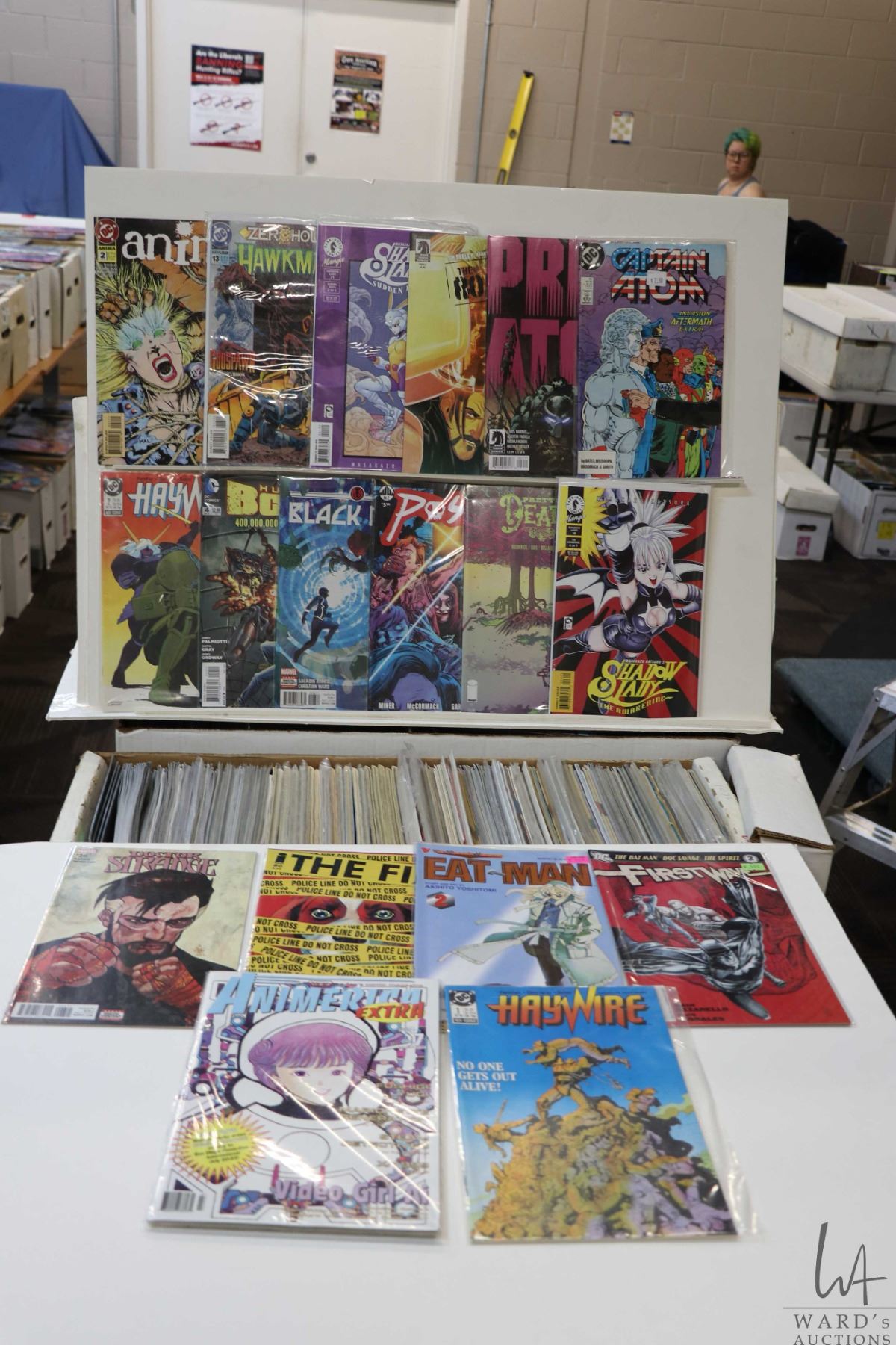 Box of approx. more than 300 comics including Shadowlady, Black Bolt, Hawk Man, Human Bomb, Haywire, Anima, etc. Important: Pickup is in Edmonton. Long comic boxes (28 x 8 x 11.5 and 23kg) will be shipped in 2 boxes approximately 11 x 9 x 12 and 13kg each through Canada Post. Long boxes can be palletized for large invoices. Details to follow