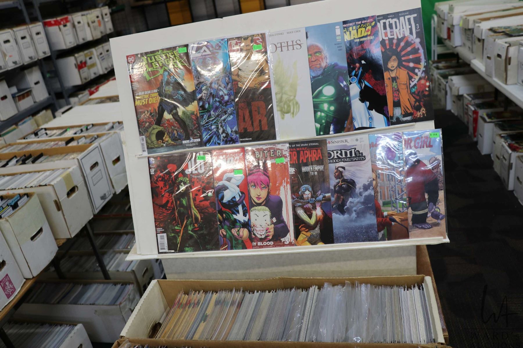 Box of approx. more than 300 comics including Spawn, Storm & the Brotherhood of Mutants, Morning Glories, Justice League Canada, Shadecraft, Motorgirl, etc. Important: Pickup is in Edmonton. Long comic boxes (28 x 8 x 11.5 and 23kg) will be shipped in 2 boxes approximately 11 x 9 x 12 and 13kg each through Canada Post. Long boxes can be palletized for large invoices. Details to follow