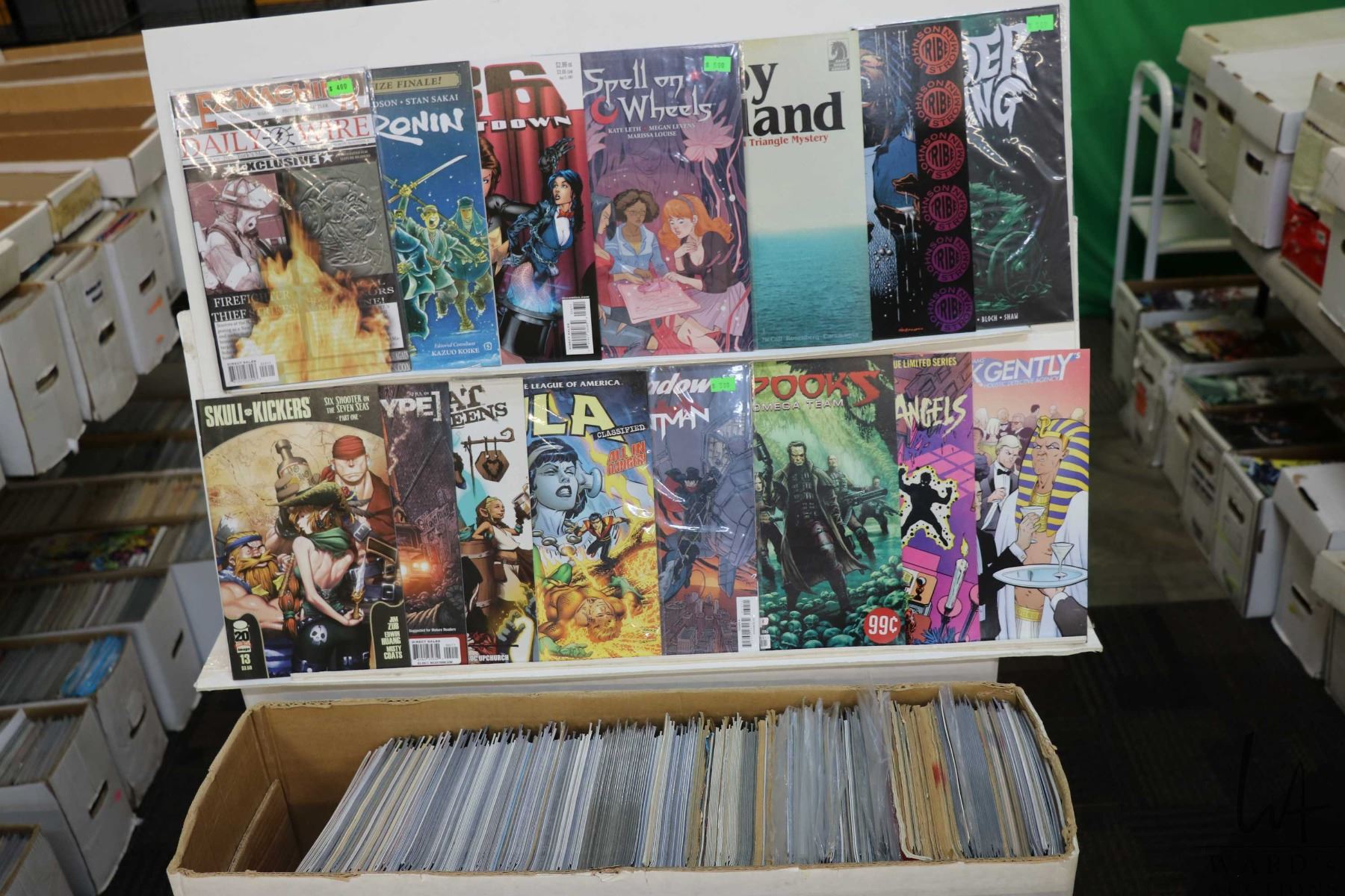 Box of approx. more than 300 comics including Spell on Wheels, Spooks, Spy Island, Fallen Angels, Tribe, Dirk Gently Holistic Detective Agency, etc. Important: Pickup is in Edmonton. Long comic boxes (28 x 8 x 11.5 and 23kg) will be shipped in 2 boxes approximately 11 x 9 x 12 and 13kg each through Canada Post. Long boxes can be palletized for large invoices. Details to follow
