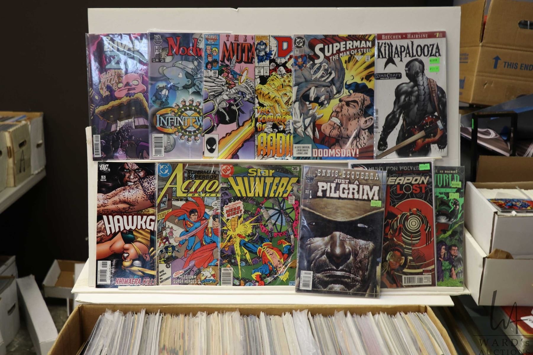 Box of approx. more than 300 comics including Star Hunters, Superman, The New Mutants, Nodwick, Invader Zim, Hawk Girl, etc. Important: Pickup is in Edmonton. Long comic boxes (28 x 8 x 11.5 and 23kg) will be shipped in 2 boxes approximately 11 x 9 x 12 and 13kg each through Canada Post. Long boxes can be palletized for large invoices. Details to follow