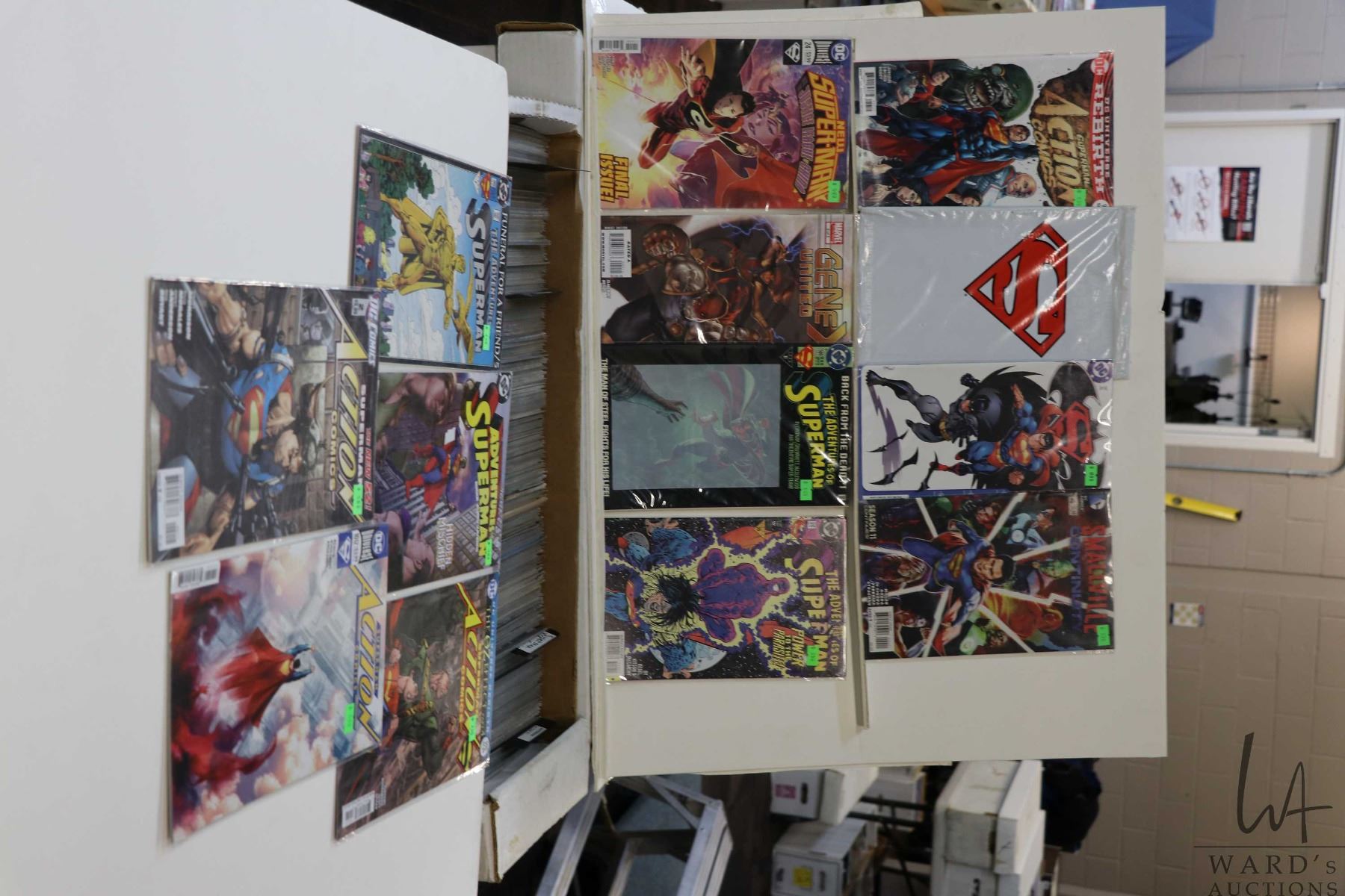Box of approx. more than 300 comics including Superman Justice League of China, Gene X United, Superman Rebirth, etc. Important: Pickup is in Edmonton. Long comic boxes (28 x 8 x 11.5 and 23kg) will be shipped in 2 boxes approximately 11 x 9 x 12 and 13kg each through Canada Post. Long boxes can be palletized for large invoices. Details to follow